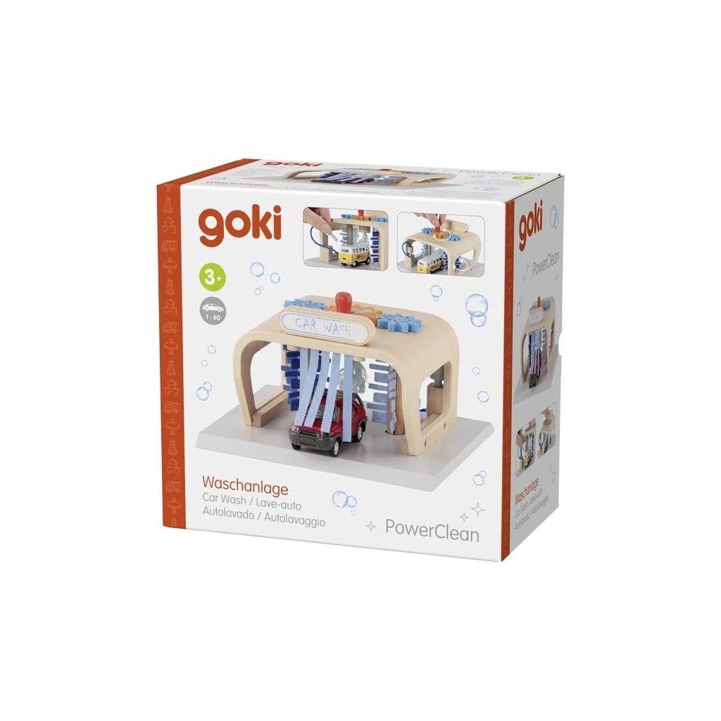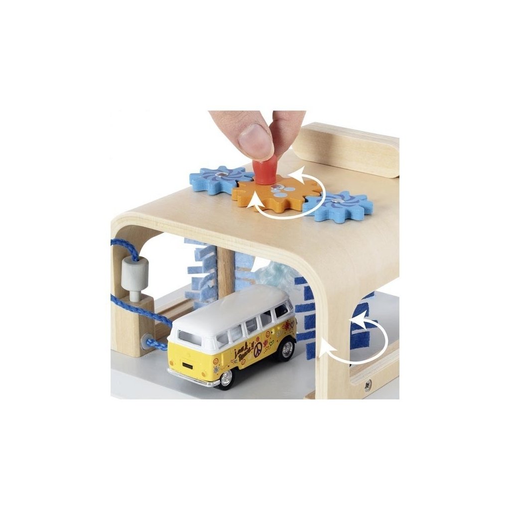 Zábava jako v opravdové myčce! Tato dřevěná myčka promění každé hraní s autíčky v akční a hravou činnost. Nejprve přijde „oplach“ vysokotlakou tryskou, poté se dají do pohybu rotační boční a střešní kartáče a nakonec autíčko usuší měkké textilní pásky. Stačí otočit ozubenými koly na střeše a myčka se dá do práce. Skvělá hračka pro rozvoj fantazie a hry na role.