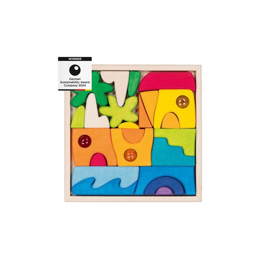 Originální krajinkové puzzle Honolulu spojuje přírodní dřevěné dílky s dekorativními třpytivými kamínky ze skla. Díky různým tvarům a možnostem skládání vznikají pokaždé nové stavby, krajiny i příběhy. Každá hra je jiná a jedinečná – přesně tak, jak si ji dítě samo vytvoří. Puzzle je ideální hračkou podporující volnou, kreativní hru, fantazii i prostorové vnímání. Krásné přírodní zpracování a jemné barvy nechávají vyniknout strukturu dřeva a dodávají celé hře estetický rozměr.
