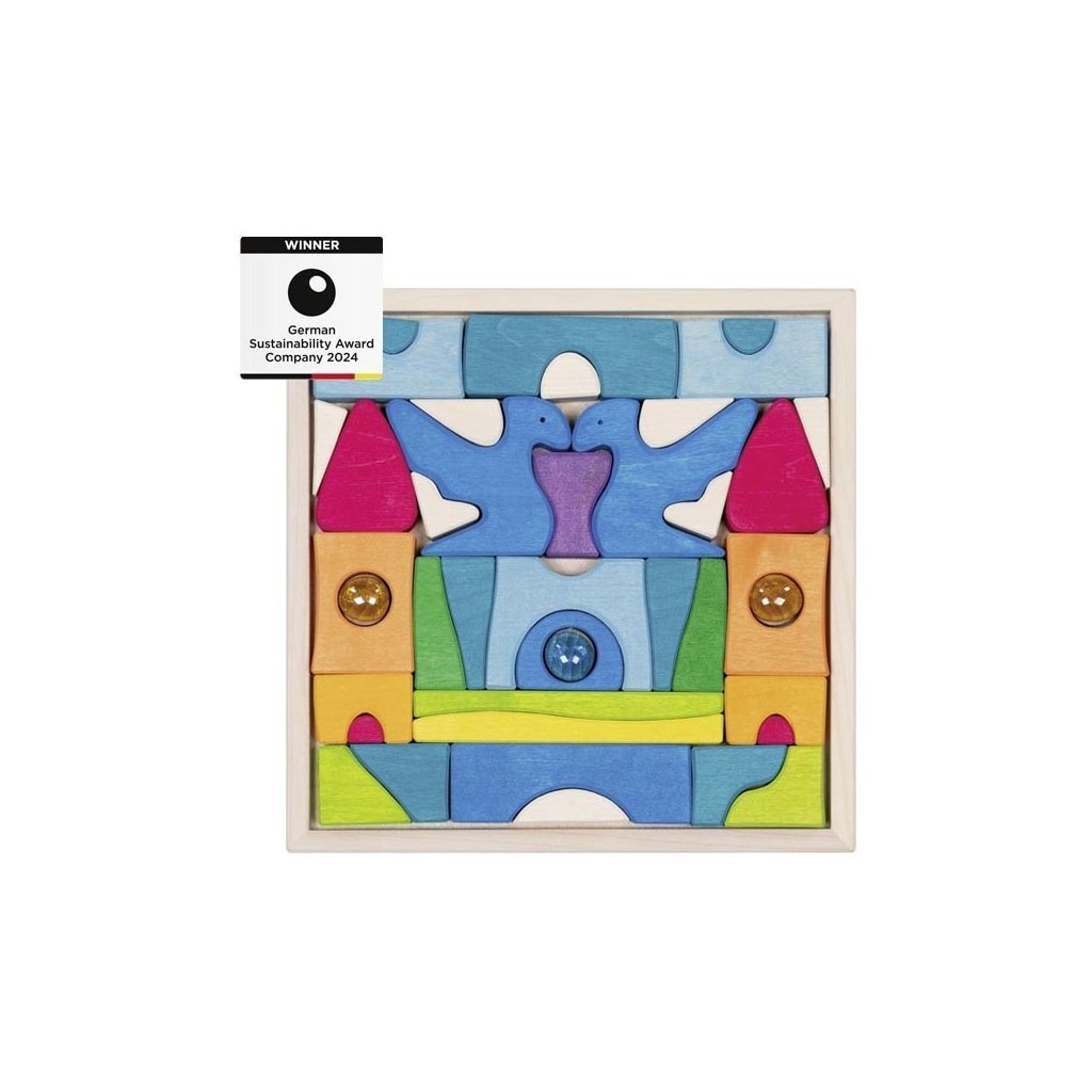 S touto kouzelnou stavební sadou Hrad Funkelstein se z malých stavitelů stávají velcí architekti. Krásně tvarované dřevěné dílky doplňují třpytivé skleněné kamínky, které se lesknou jako drahokamy a dodávají každé stavbě jedinečný kouzelný nádech. Děti mohou z kostek vytvářet pohádkové zámky, tajemné hrady i fantazijní věže – možnostem se meze nekladou. Stavebnice podporuje volnou a kreativní hru, rozvíjí představivost, jemnou motoriku i prostorové myšlení. Vyrobena z přírodních materiálů, s důrazem na kvalitu a udržitelnost, 100 % v Evropě.