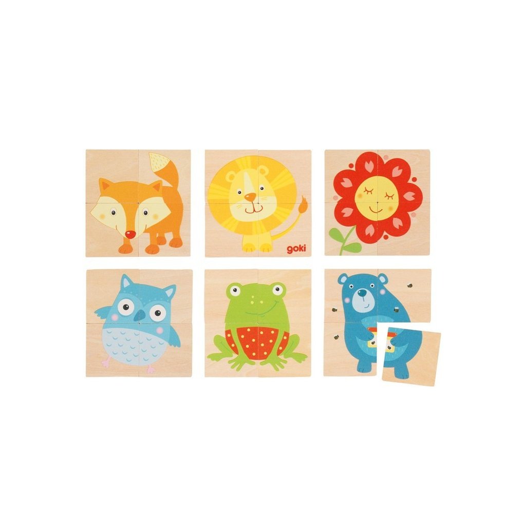 Děti poznávají zvířátka tak, že nejprve skládají obrázky. Později je možné skládat v kombinaci s paměťovou hrou. Hra obsahuje 6 motivů. Vyrobeno z kvalitní překližky. Vhodné od 2 let.
