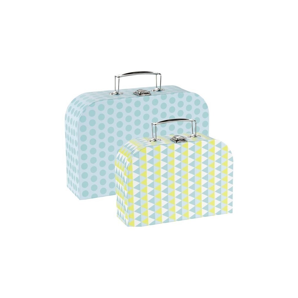 Moderně vzorované kufříky jsou laděny do barvy modré a zelené. Jsou vyrobeny ze stabilní lepenky a držáčky jsou plechové. Větší kufřík má velikost 30 x 20,4 x 9 cm, menší 25 x 17,7 x 8,5 cm. Výrobek je vhodný pro děti od 3 let.