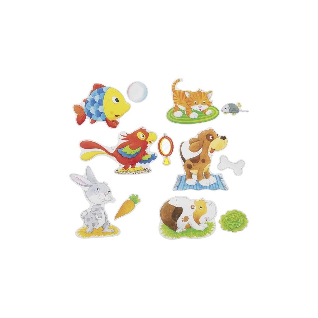 Set puzzlí o 24 dílkách, po správném sestavení, zobrazuje zvířátka, která běžně chováme v domácnostech s jejich oblíbeným jídlem či hračkou.