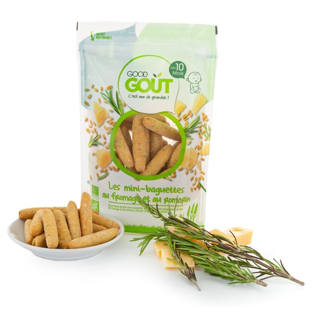 Tyhle francouzské minibagetky jsou sestrami bagetek s rajčátky. Pro dětské labužníky, kteří rádi zkoušejí něco neobvyklého, je tentokrát bio celozrnná mouka smíchaná s kapkou extra panenského olivového oleje obohacena bio sýrem a provoněná rozmarýnem. Šmrnc bagetkám stejně jako v případě bagetek s rájčátky dodává to správné množství agenta jménem kvasnice.