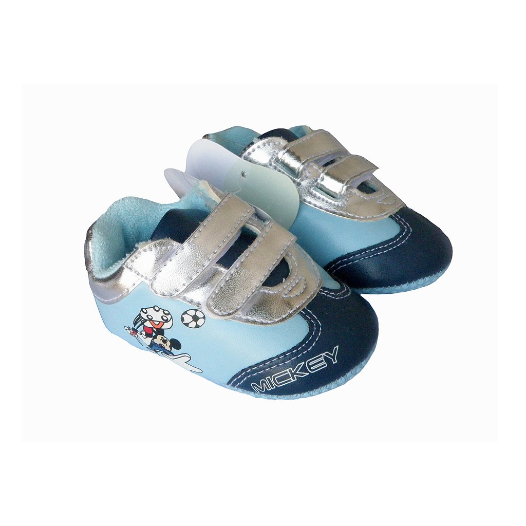 Stylové dětské capáčky s motivem Mickeyho Mouse připomínající opravdové tenisky. Botičky mají suché zipy a modrou barvu s tmavě modrými a stříbrnými detaily. Nejsou určeny na chození.