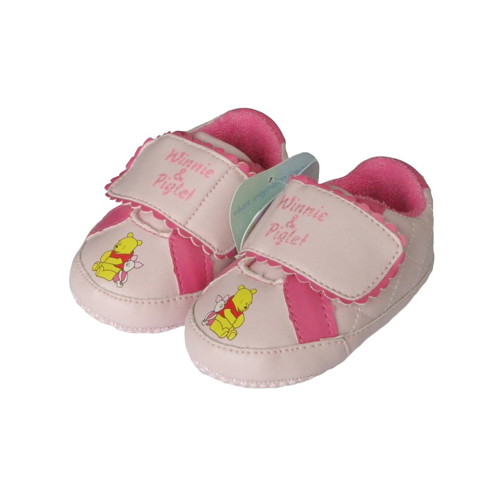 Stylové dětské capáčky s motivem medvídka Pooh připomínající opravdové tenisky. Botičky mají suchý zip a světle růžovou barvu s tmavě růžovými detaily. Nejsou určeny na chození.