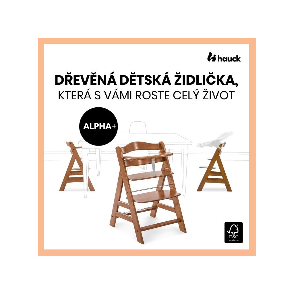Alpha+ je vyrobena z evropského bukového dřeva pocházejícího z lesů s certifikátem FSC®, který oceňuje trvale udržitelné a ekologické lesní hospodaření na ochranu rostlin a zvířat. Díky nastavitelnému sedátku a nožní opěrce se židlička Alpha+ přizpůsobí růstu vašeho dítěte. Díky stabilní konstrukci lze židličku používat až do hmotnosti 90 kg. Díky stabilní konstrukci a integrovaným podlahovým kluzákům je židlička Alpha+ odolná proto převrhnutí. Když se vaše dítě od stolu odstrčí, židlička se jednoduše mírně posune dozadu. Bezpečnostní pás i pětibodové bezpečnostní pásy jsou součástí balení a pomáhají zajistit bezpečnost vašeho dítěte. Jsou také kompatibilní s dalším příslušenstvím hauck. Ochranný oblouk je nezbytný pro menší děti, později jej lze odejmout, aby mohlo dítě pohodlně sedět u jídelního nebo psacího stolu. Jídelní židličku Alpha+ lze zkombinovat s příslušenstvím Křesílko/sedátko díky čemuž lze židličku použít již od narození. V balení je 5ti bodový bezpečnostní pás, vysoká židlička, ochranný oblouk, bezpečnostní mezi-nožní popruh. Vhodná pro děti od 6 měsíců do 90 kg.