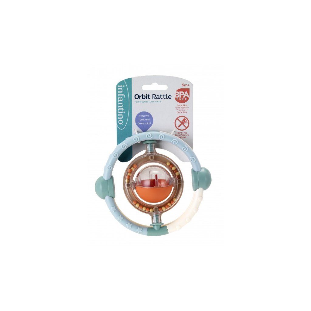 Chrastítko Infantino s různými texturami má tvar pro snadné uchopení a zkoumání ručičkami i v ústech. Korálky uvnitř průhledného kroužku při pohybu jemně chrastí. Chrastítko podporuje rozvoj jemné motoriky dítěte i jednotlivých smyslů. Vhodné pro děti od 6 měsíců.