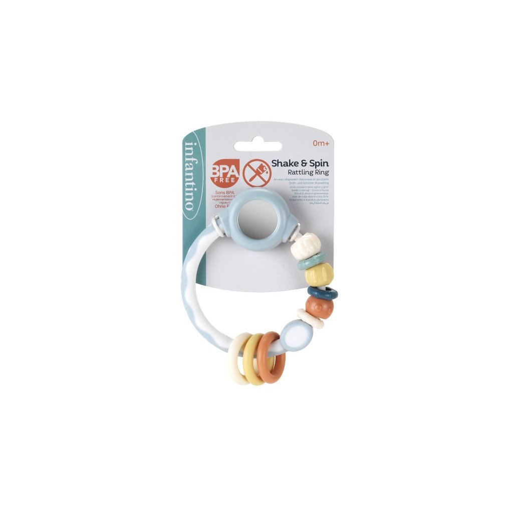 Lehké chrastítko Infantino zabaví vaše miminko doma i na cestách. Barevné kroužky se posouvají a otáčí, různé textury vybízí k prozkoumávání prstíky i v ústech. Nechybí ani bezpečné zrcátko, které přitáhne pozornost miminka. Hračka má tvar pro snadné uchopení malými dětskými ručičkami. Chrastítko podporuje rozvoj jemné motoriky dítěte i jednotlivých smyslů. Vhodné pro děti od narození.