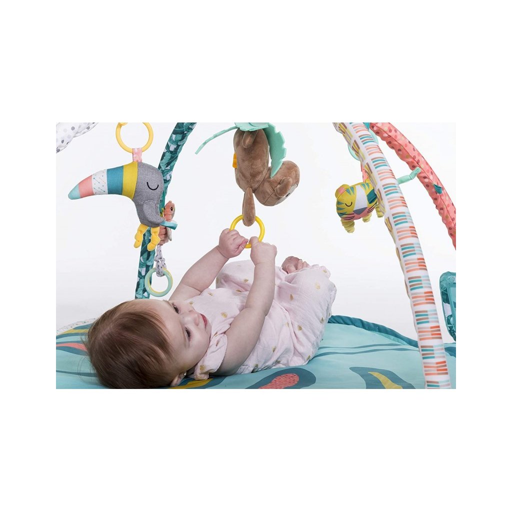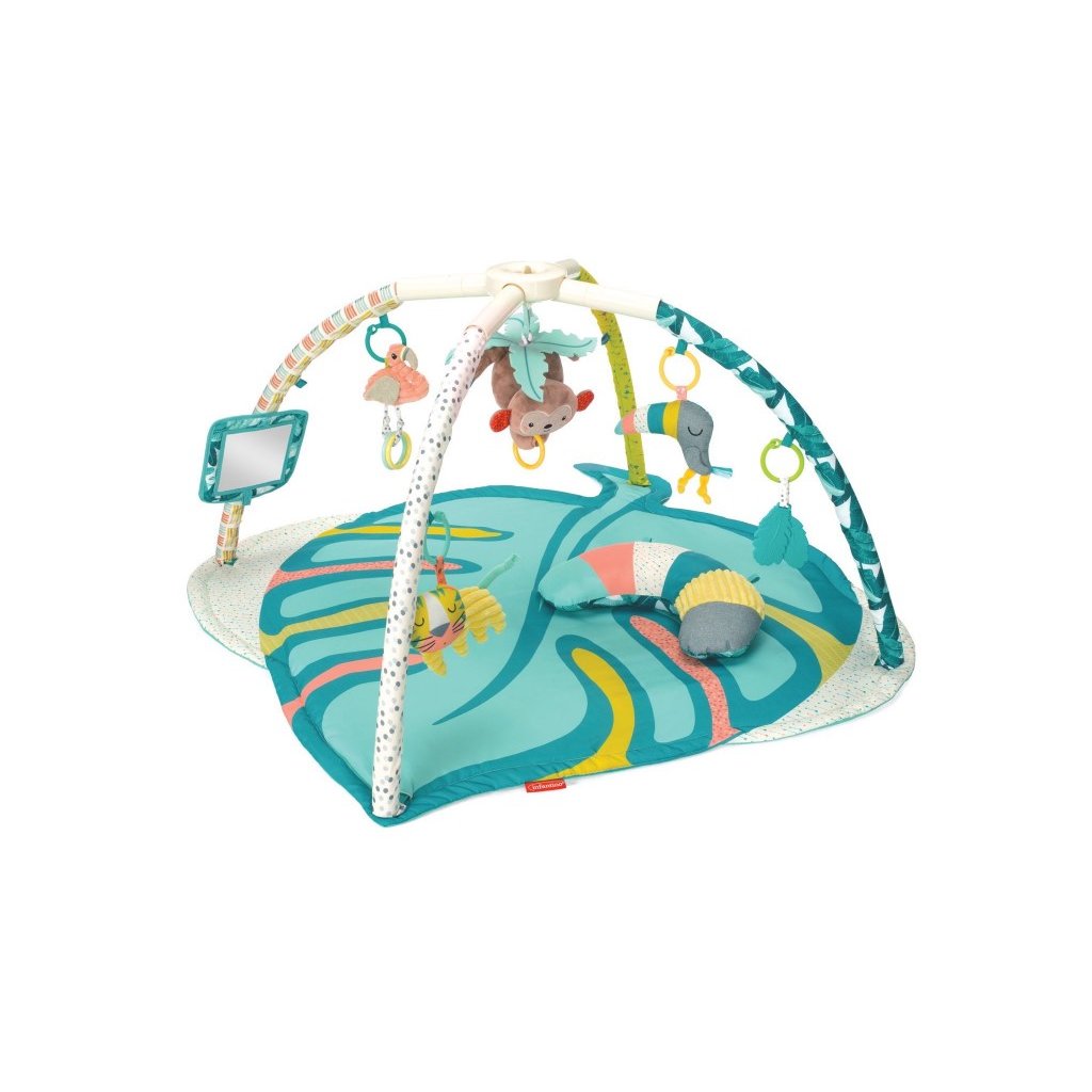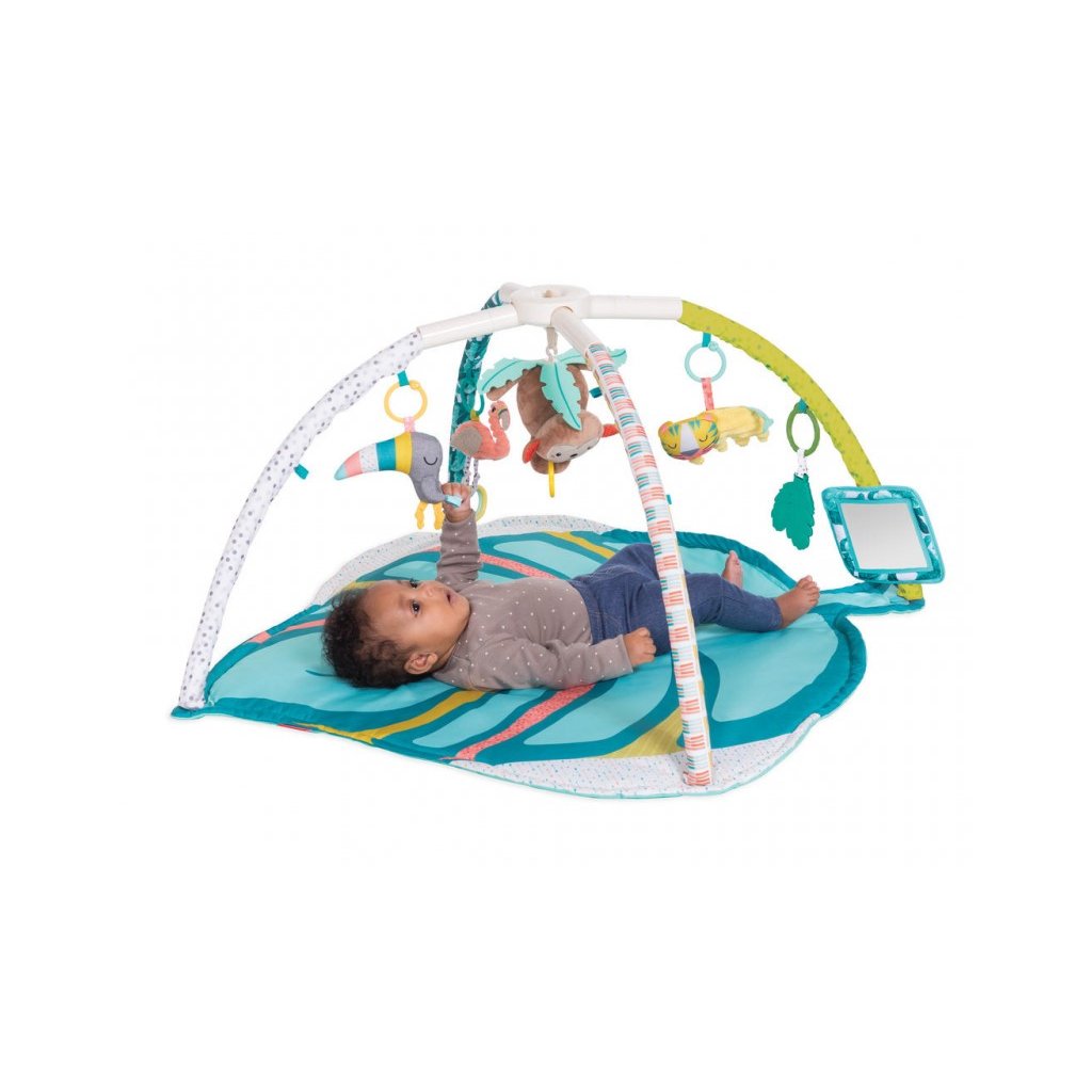 Hrací deka s krásnými ilustracemi a hračkami v podobě zvířátek ze zoo nabízí množství aktivit, které stimulují rozvoj jednotlivých smyslů dítěte. Speciální polštářek a bezpečné zrcátko podněcují dítě ke hře na bříšku. Závěsné hračky je možno připevnit k ramenům hrazdy, aby je dítě mohlo zkoumat při ležení na zádech, nebo se mohou připevnit k polštářku pro hraní v poloze na bříšku. Hudební box v podobě plyšové opičky hraje po natažení melodii a můžete jej používat i samostatně např. na autosedačce nebo v kočárku. Deku s hrazdou díky středovému dílu Twist & Fold snadno složíte do kompaktního tvaru pro přenášení. Můžete ji tak využívat pro zabavení vašeho dítěte nejen doma, ale i na cestách. Vhodné pro děti od narození.