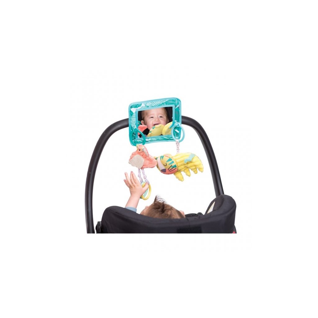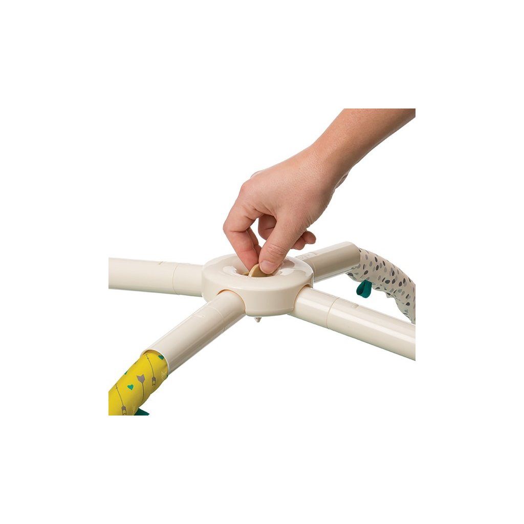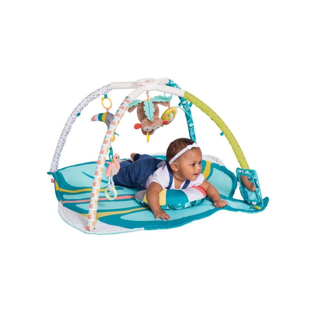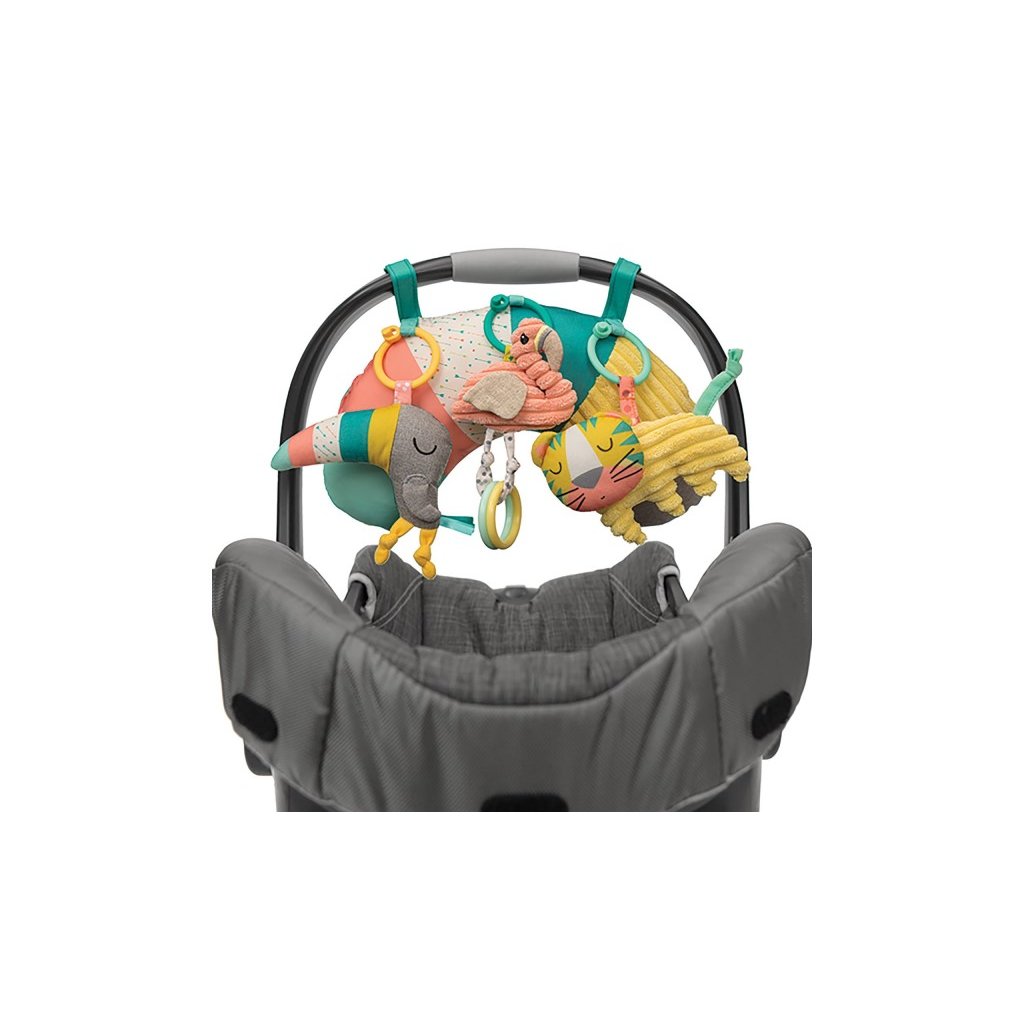Hrací deka s krásnými ilustracemi a hračkami v podobě zvířátek ze zoo nabízí množství aktivit, které stimulují rozvoj jednotlivých smyslů dítěte. Speciální polštářek a bezpečné zrcátko podněcují dítě ke hře na bříšku. Závěsné hračky je možno připevnit k ramenům hrazdy, aby je dítě mohlo zkoumat při ležení na zádech, nebo se mohou připevnit k polštářku pro hraní v poloze na bříšku. Hudební box v podobě plyšové opičky hraje po natažení melodii a můžete jej používat i samostatně např. na autosedačce nebo v kočárku. Deku s hrazdou díky středovému dílu Twist & Fold snadno složíte do kompaktního tvaru pro přenášení. Můžete ji tak využívat pro zabavení vašeho dítěte nejen doma, ale i na cestách. Vhodné pro děti od narození.