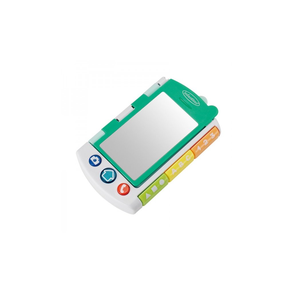 Zábavná interaktivní hračka Infantino, která spojuje telefon na hraní a malou obrázkovou knížku plnou překvapení. Na přední straně má velké zrcátko a tlačítka, se kterými si dítě může hrát na volání nebo focení. Po otevření stránek se spustí vzdělávací obsah – hračka přečte jednoduché věty a vybízí děti k objevování tvarů, barev a čísel. Hudební část nabízí 4 originální písničky, 43 povzbuzujících frází a 6 zábavných zvukových efektů. Všechny mluvené části jsou v angličtině. Vyměnitelné baterie 2xAAA 1,5V součástí výrobku. Vhodné pro děti od 6 do 36 měsíců.