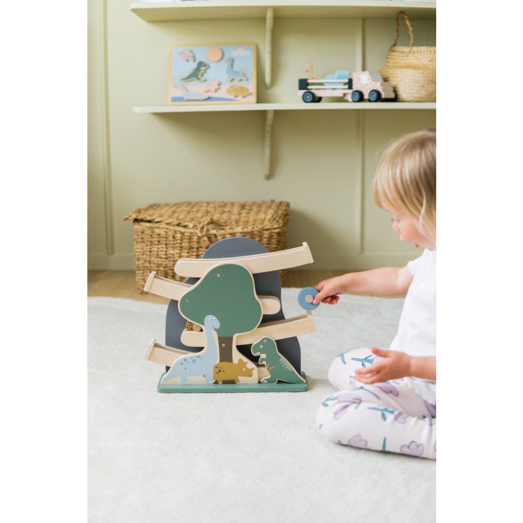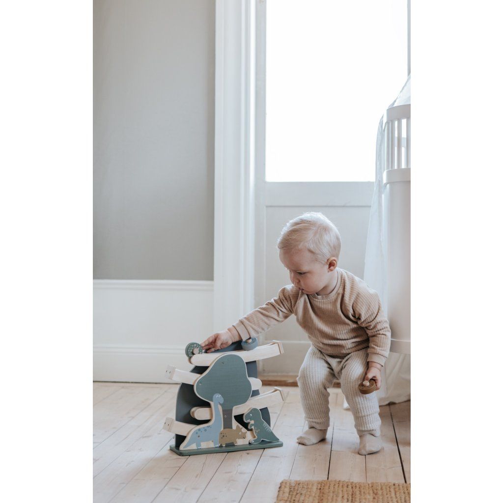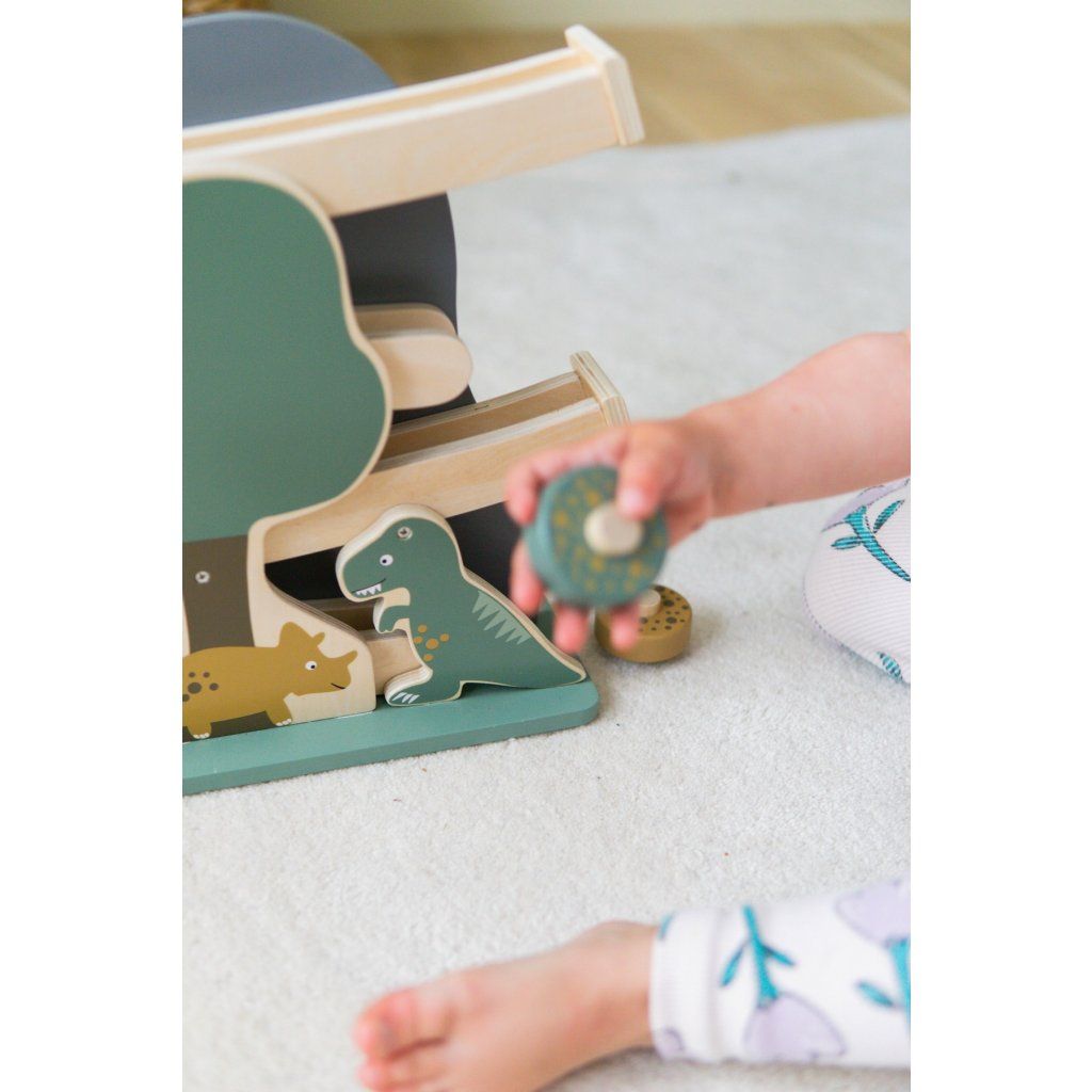 Zábavná dřevěná dráha s dinosauřím motivem nadchne každého malého objevitele. Barevná vajíčka se kutálejí po klikaté trase a vytvářejí poutavý pohyb, který děti zabaví na dlouhou dobu. Hračka přirozeně rozvíjí motoriku, koordinaci i pozorovací schopnosti a představuje originální alternativu ke klasickým autodráhám.
