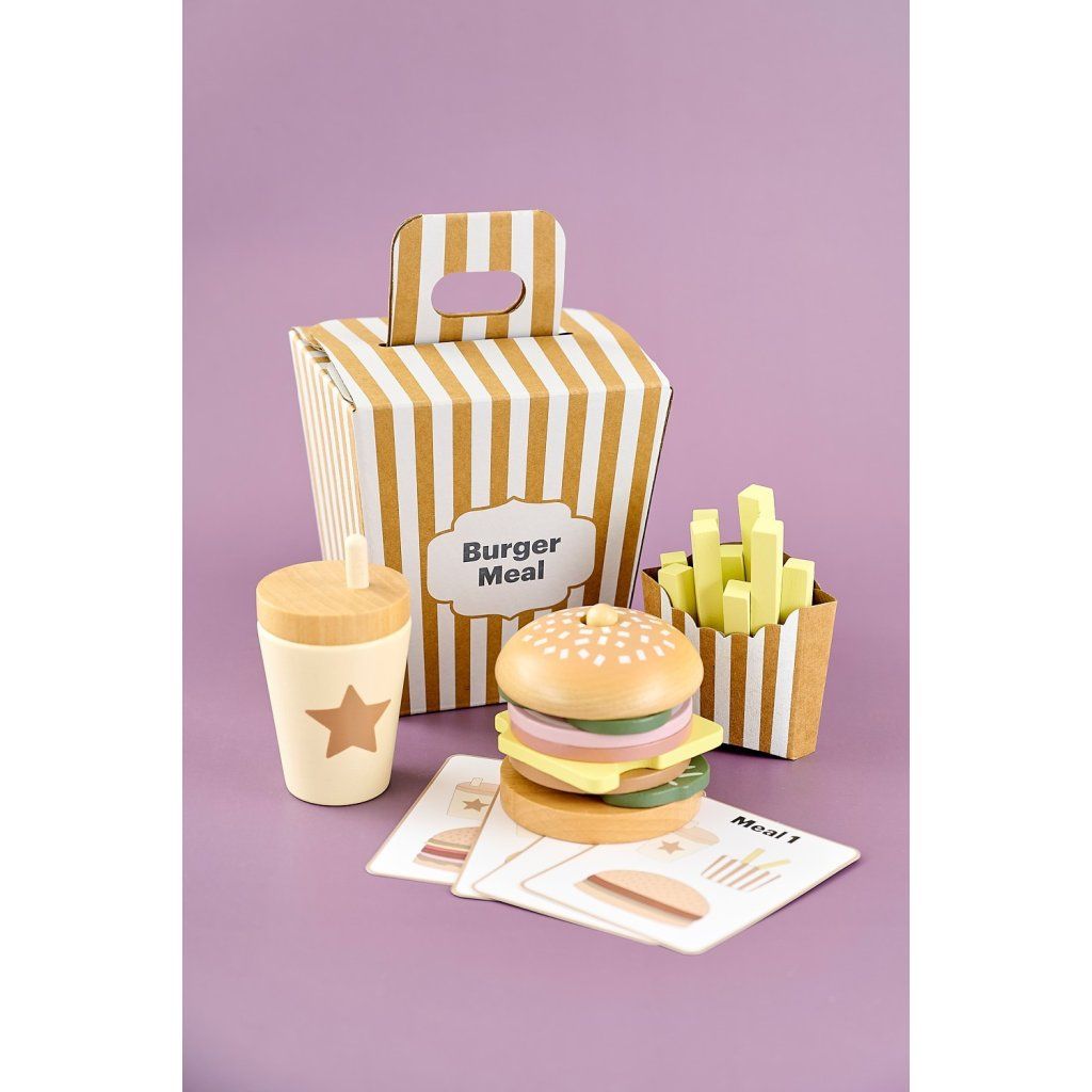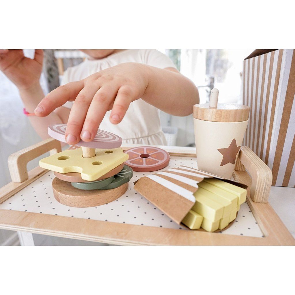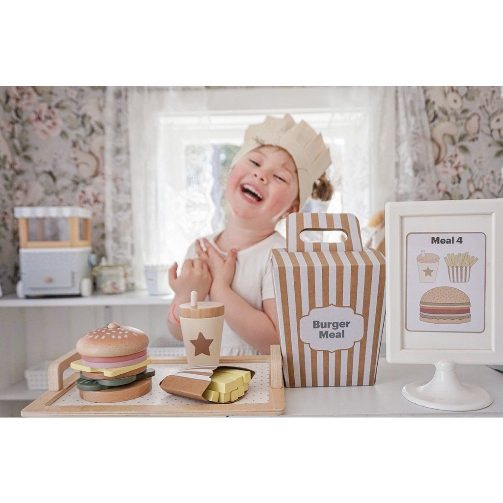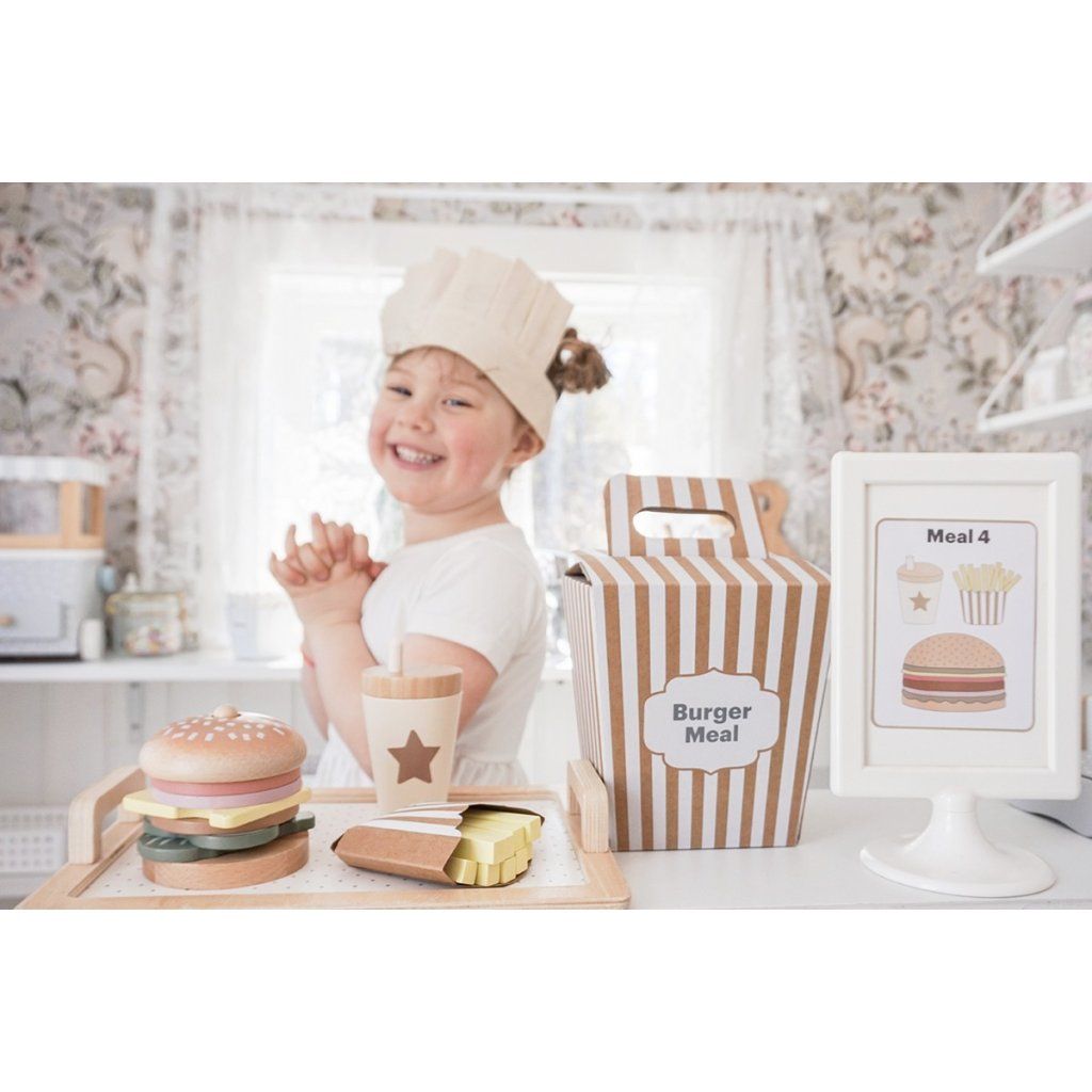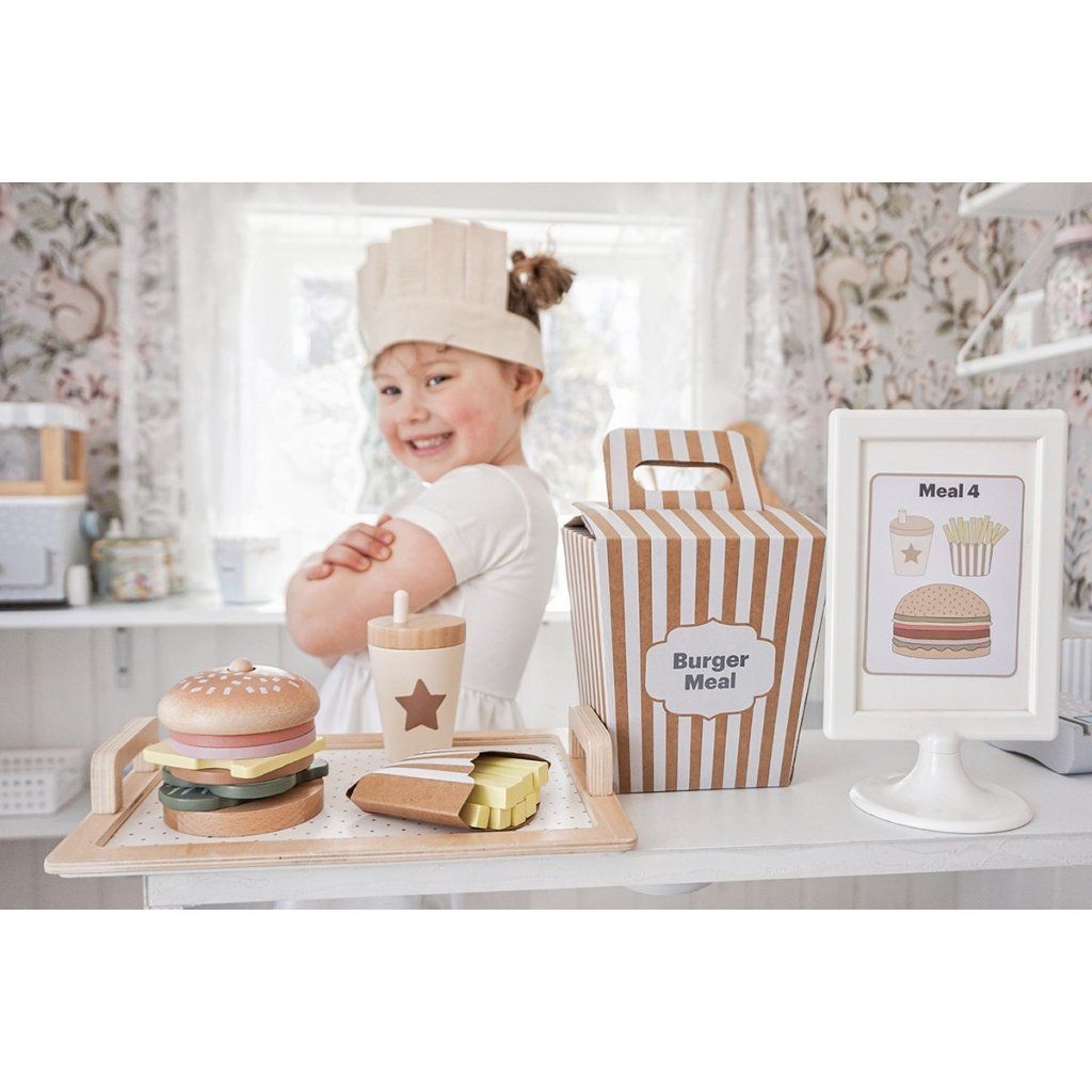Připravte ty nejchutnější „burgery“ podle vlastní fantazie! Tento hravý hamburgerový set umožní dětem skládat vlastní menu, kombinovat ingredience a objevovat radost z vaření i servírování. Každý burger může být jiný – přesně podle chuti malého kuchaře. Díky doplňkům a kartám s inspirací si děti užijí nejen kreativní hru, ale i zábavné napodobování skutečného stravování.