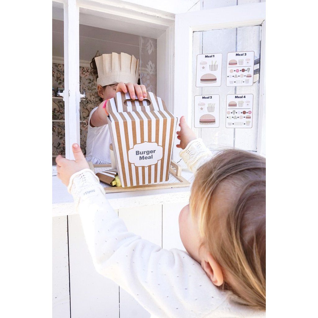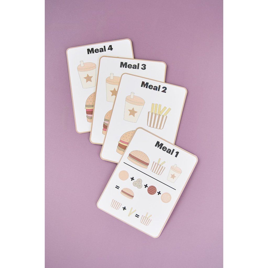 - Obsah balení: houska, okurka, burger, sýr, rajče, salát, hranolky, 4× jídelní karta