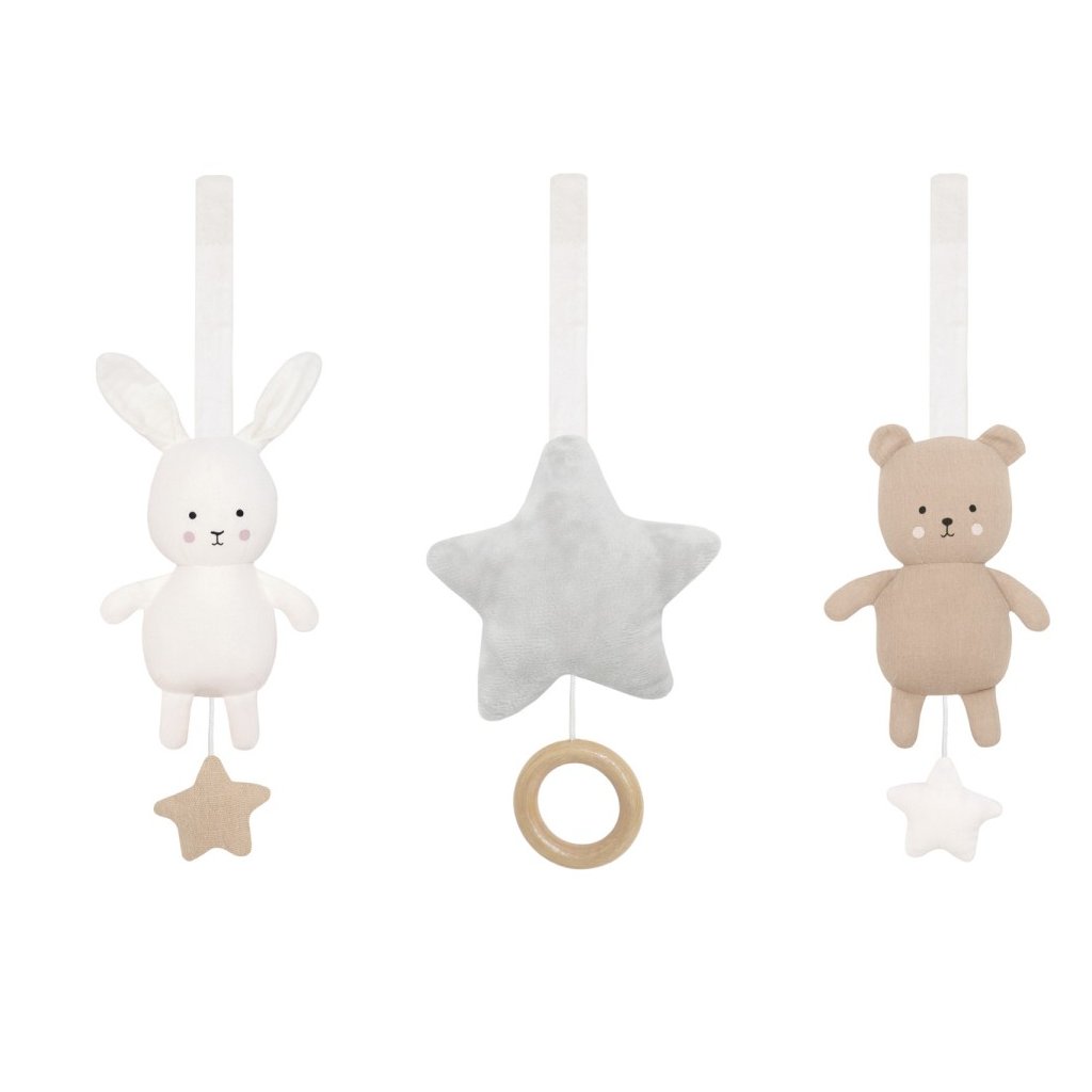 Roztomilé dětské hračky na hrazdičku Jabadabado Medvídek, zajíček a hvězdička. Připevňují se na hrazdičku pomocí suchého zipu a tak lze snadno přesouvat. Hvězdička je hudební skříňka, která hraje ukolébavku (Brahms Lullaby). Zajímavé tvary a barvy hraček zabaví miminko na delší dobu.