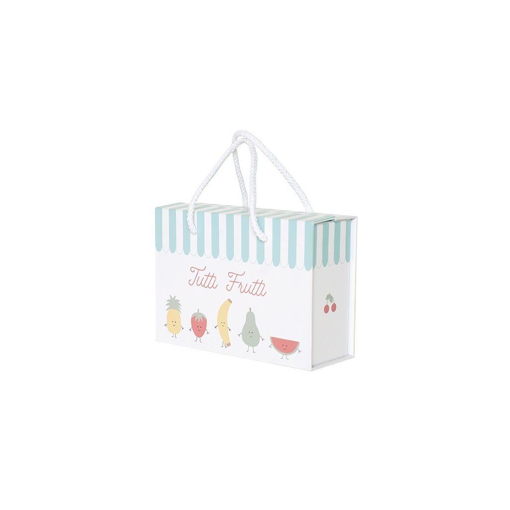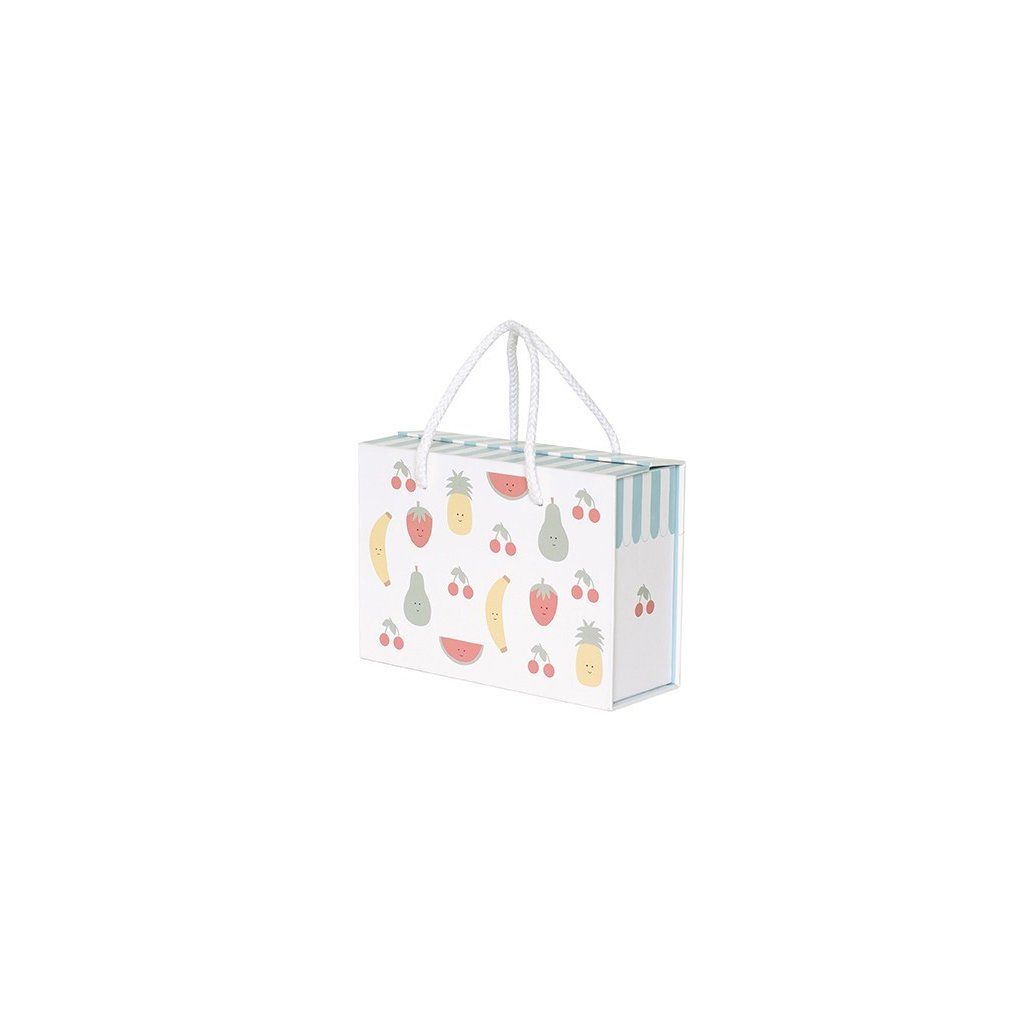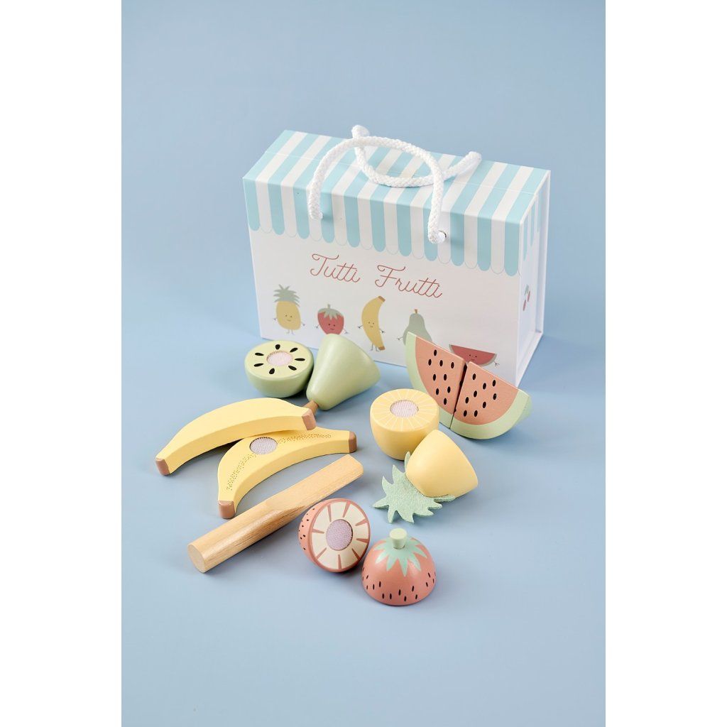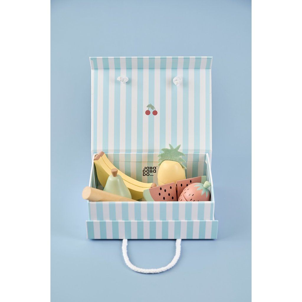 - Obsah balení: hruška, meloun, jahoda, ananas, banán, dřevěný nůž, látková taška