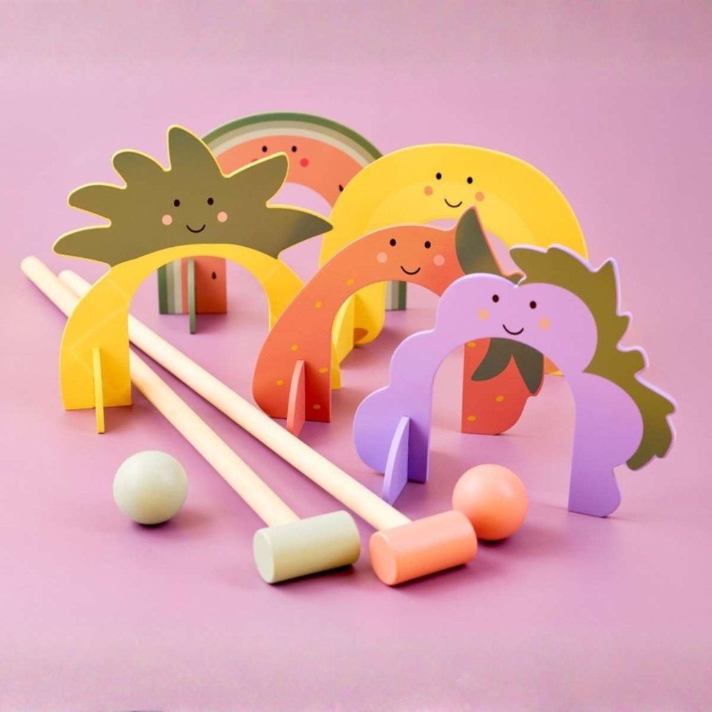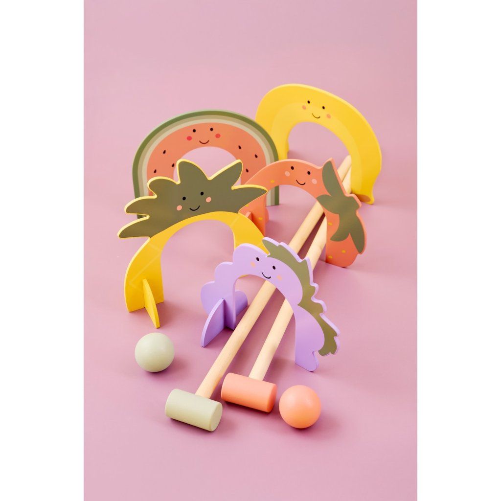Barevná dřevěná kroketová sada s hravými kužely ve tvaru ovoce přináší dětem spoustu pohybu i zábavy na čerstvém vzduchu. Hra je ideální pro společné chvíle s rodinou nebo kamarády a podporuje zdravou soutěživost. Díky jednoduchým pravidlům si ji snadno užijí i menší děti.