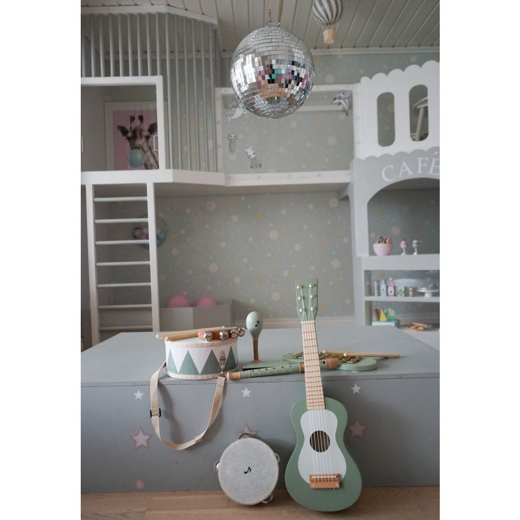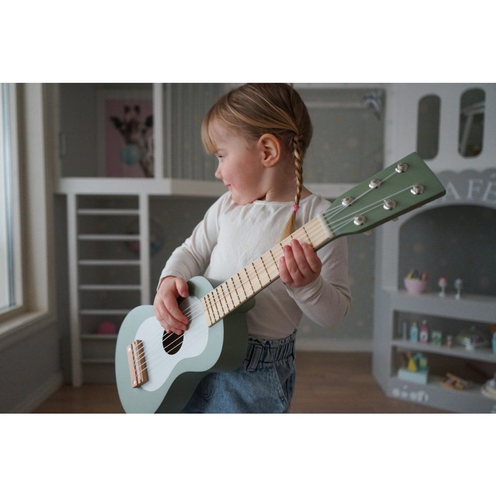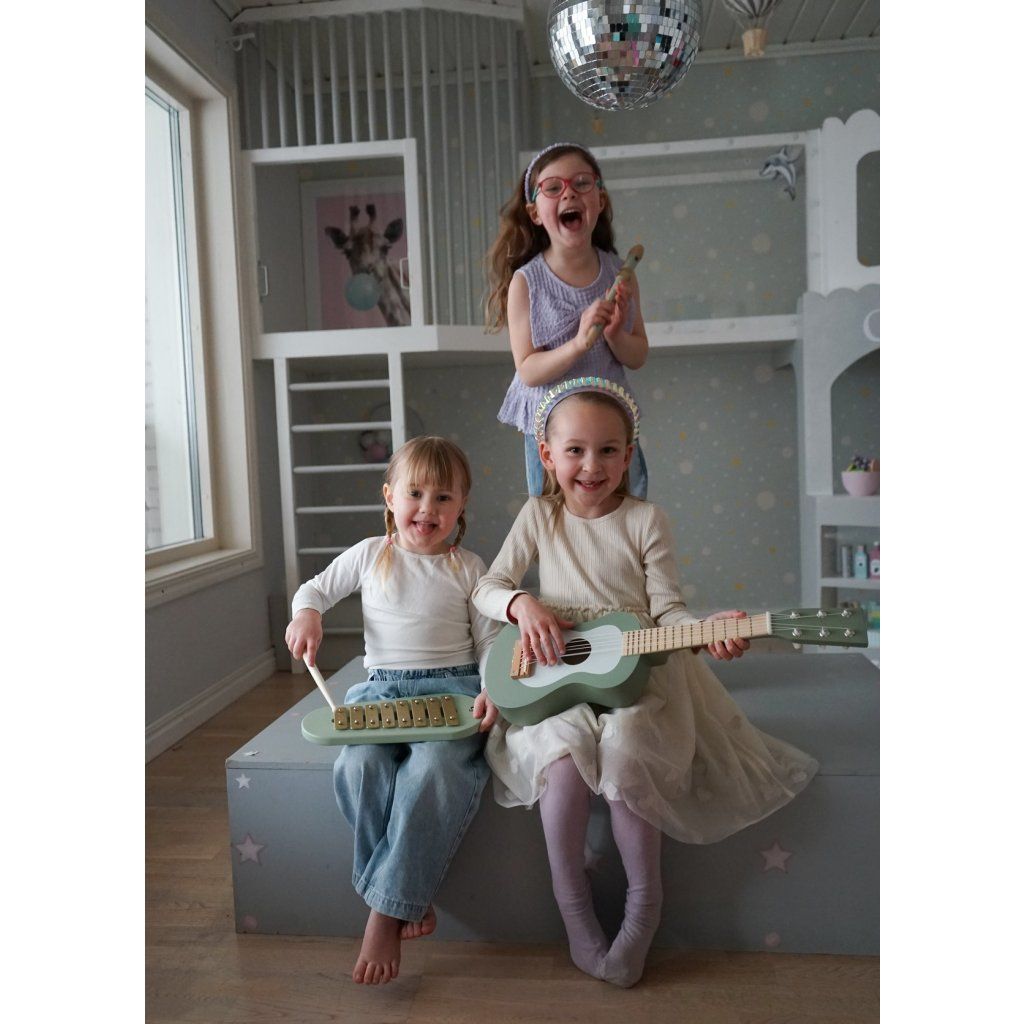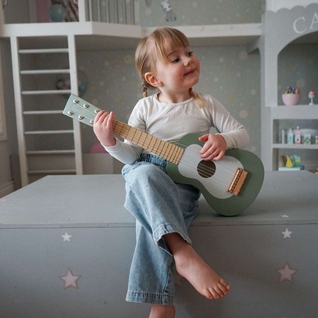 Dřevěná kytara je skvělým nástrojem pro malé hudebníky, kteří chtějí objevovat svět tónů a rytmu. Díky 6 strunám si děti mohou vyzkoušet první hudební pokusy a napodobit hru na skutečnou kytaru. Struny lze ladit, což přidává hře na realističnosti a umožňuje dětem ještě více se ponořit do hudebního světa.