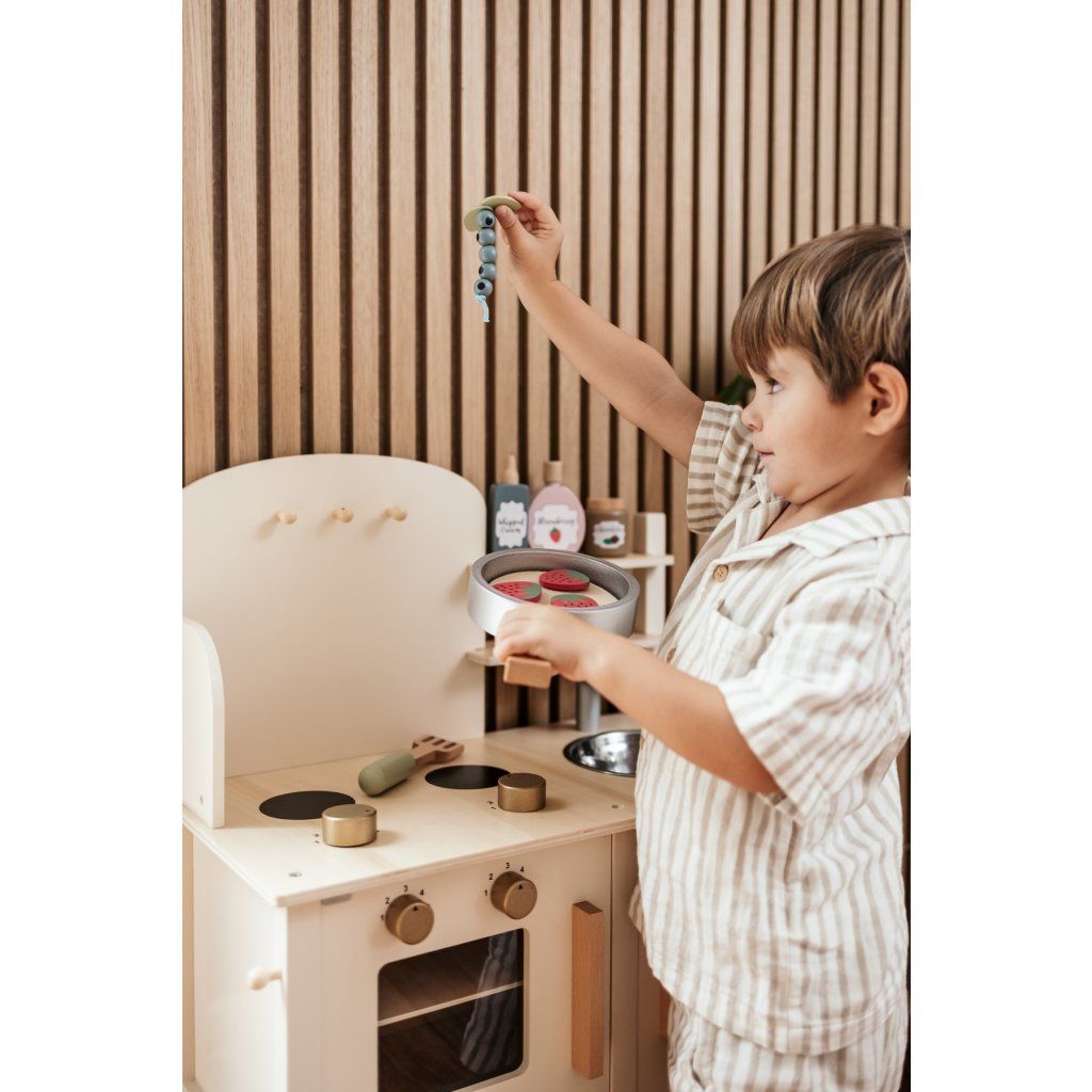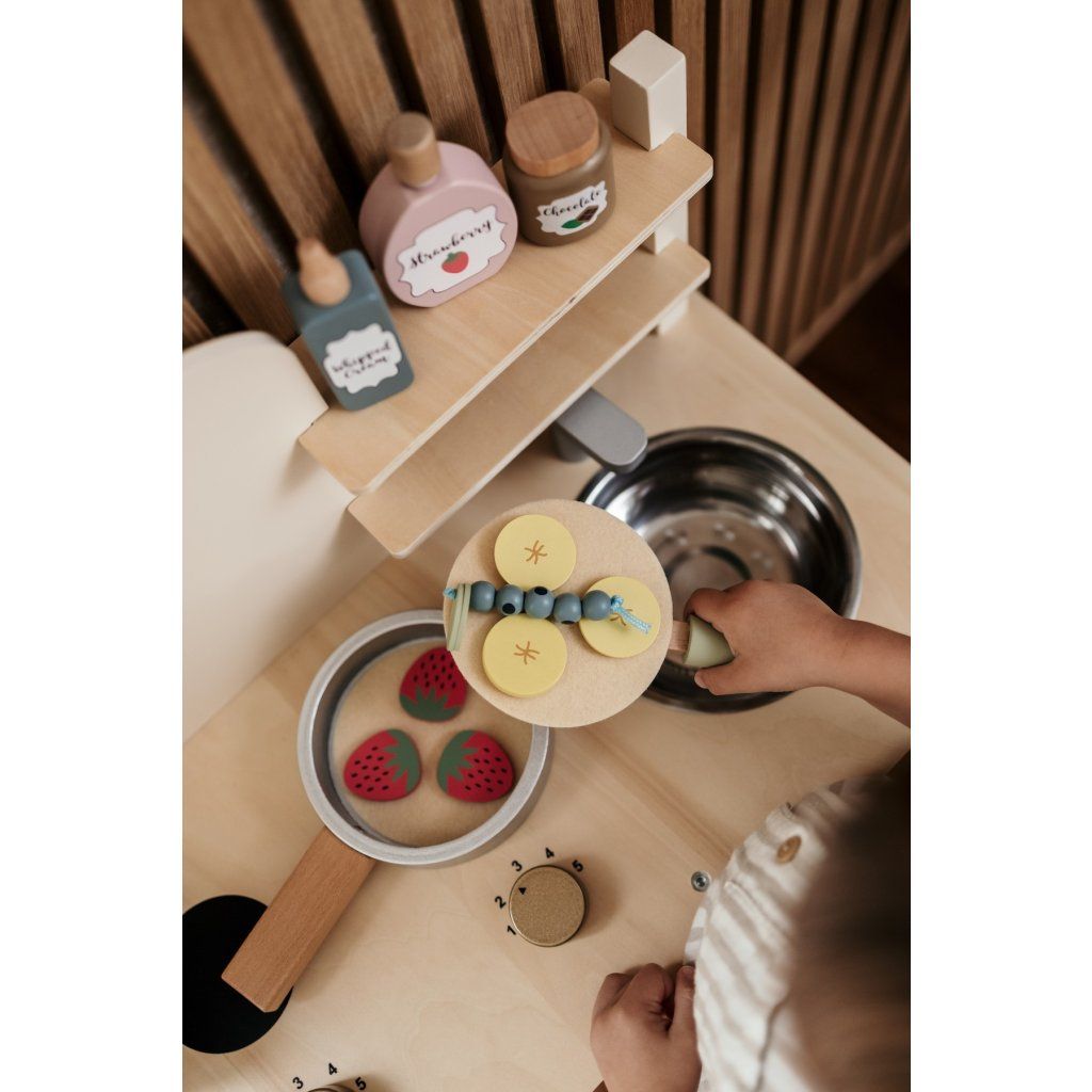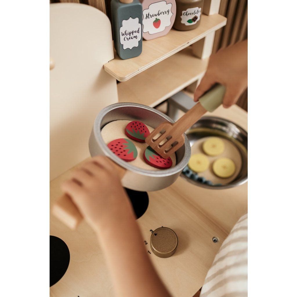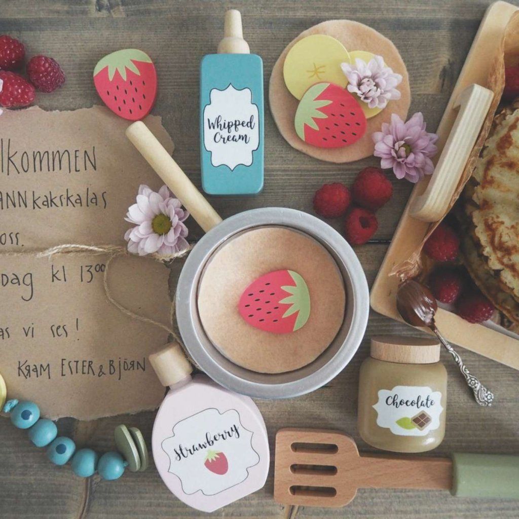 Dřevěná sada na palačinky umožní dětem zahrát si na skutečné kuchaře a připravovat „lahodné“ palačinky jako v opravdové kuchyni. Díky realistickému provedení a bohatému příslušenství se hra stává zábavným a kreativním zážitkem, který děti jen tak neomrzí. Jednotlivé ingredience lze kombinovat a servírovat podle vlastní fantazie, což podporuje dlouhé a nápadité hraní.