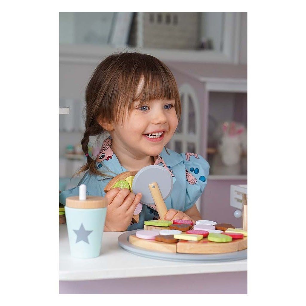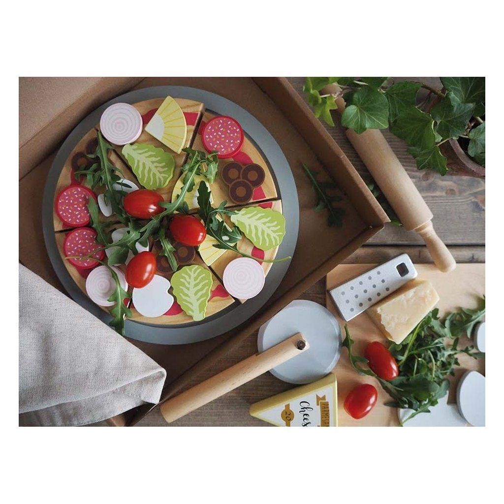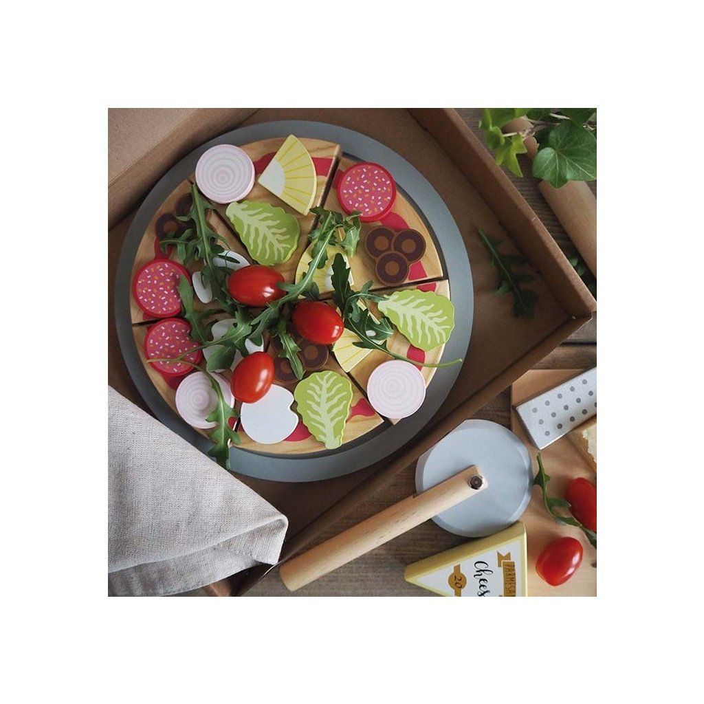 Víkend se blíží as ním i čas na domácí pizzu! Pozvěte na ni své přátele a úspěch je zaručen. Jako základ je samozřejmě rajčatová omáčka a sýr. A na vrch pizzy si pomocí suchých zipů přidáte, co máte rádi. 6 dílů pizzy také drží spolu pomocí suchých zipů a snadno se „nakrájí“. Pizza obsahuje: 3 žampiony, 3 kolečka salámu, 3 cibulové kroužky, 3 listy salátu, 3 kousky ananasu, 3 olivy, pizza talíř a kráječ na pizzu. Samozřejmě se nachází v krabici na pizzu.