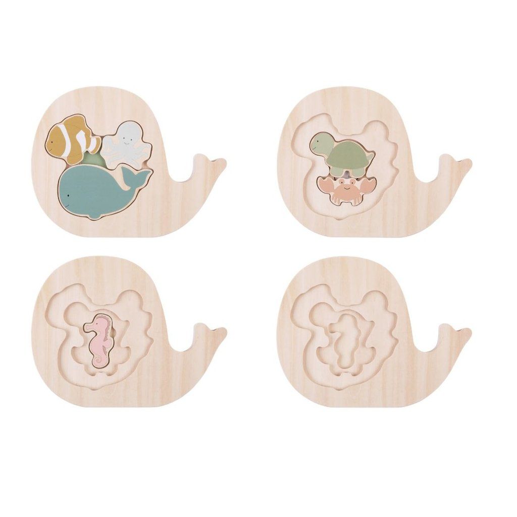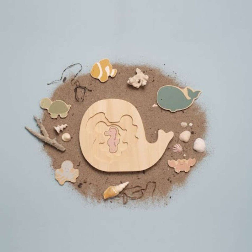 Zábavné vrstvené dřevěné puzzle s motivem mořského světa, které děti skládají postupně do šesti vrstev. Každá vrstva odhaluje další mořská zvířátka a podporuje tak objevování i logické myšlení. Jednotlivé dílky jsou navržené pro snadné uchopení malými dětskými ručičkami a dají se využít i samostatně ke hře.