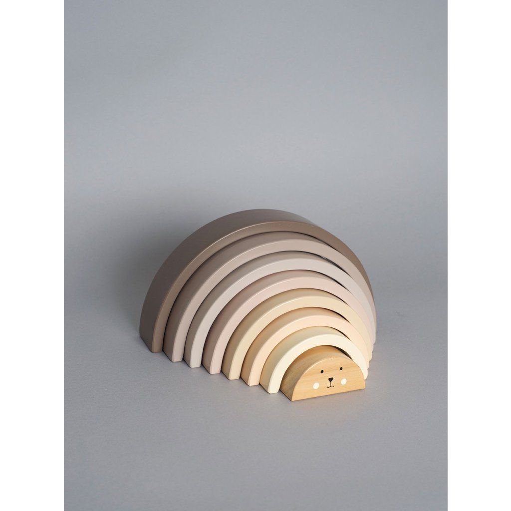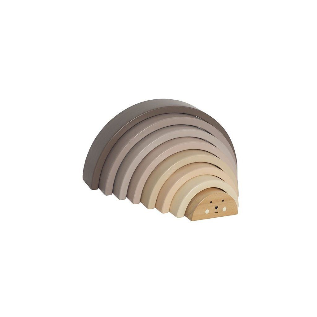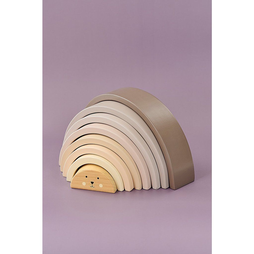 Kreativní dřevěná stavebnice ve tvaru duhy, která nabízí nekonečné možnosti hraní. Osm různých dílů lze skládat na sebe nebo používat samostatně – děti si tak mohou stavět tunely, mosty, domečky nebo cokoliv, co si představí. Hračka podporuje fantazii a volnou hru bez omezení.