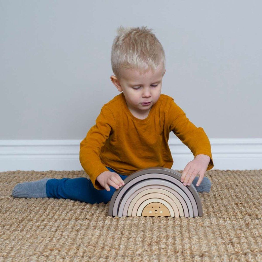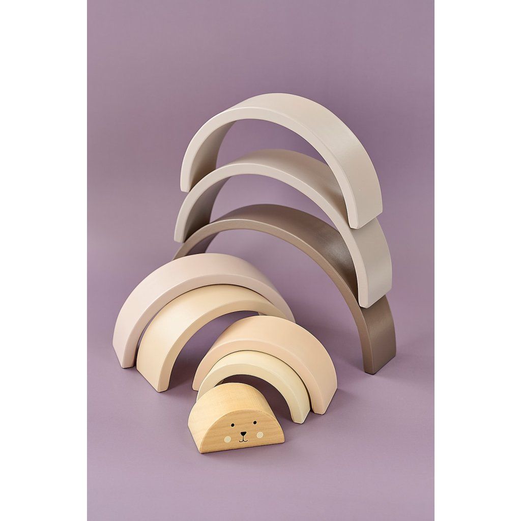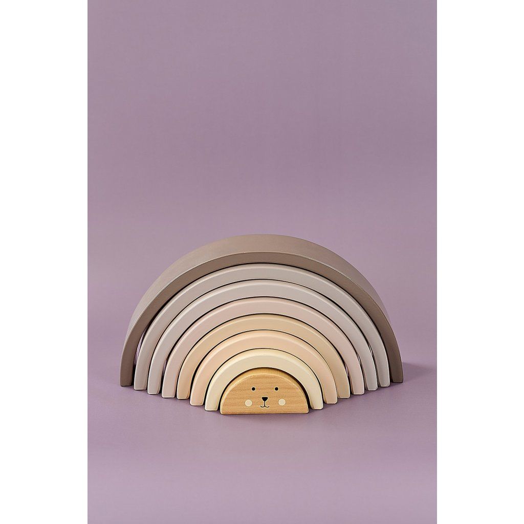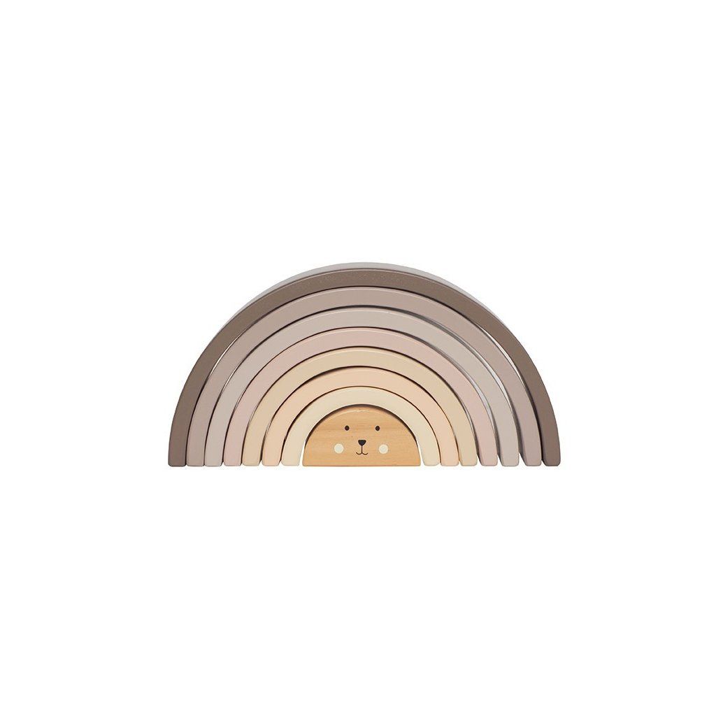 Kreativní dřevěná stavebnice ve tvaru duhy, která nabízí nekonečné možnosti hraní. Osm různých dílů lze skládat na sebe nebo používat samostatně – děti si tak mohou stavět tunely, mosty, domečky nebo cokoliv, co si představí. Hračka podporuje fantazii a volnou hru bez omezení.