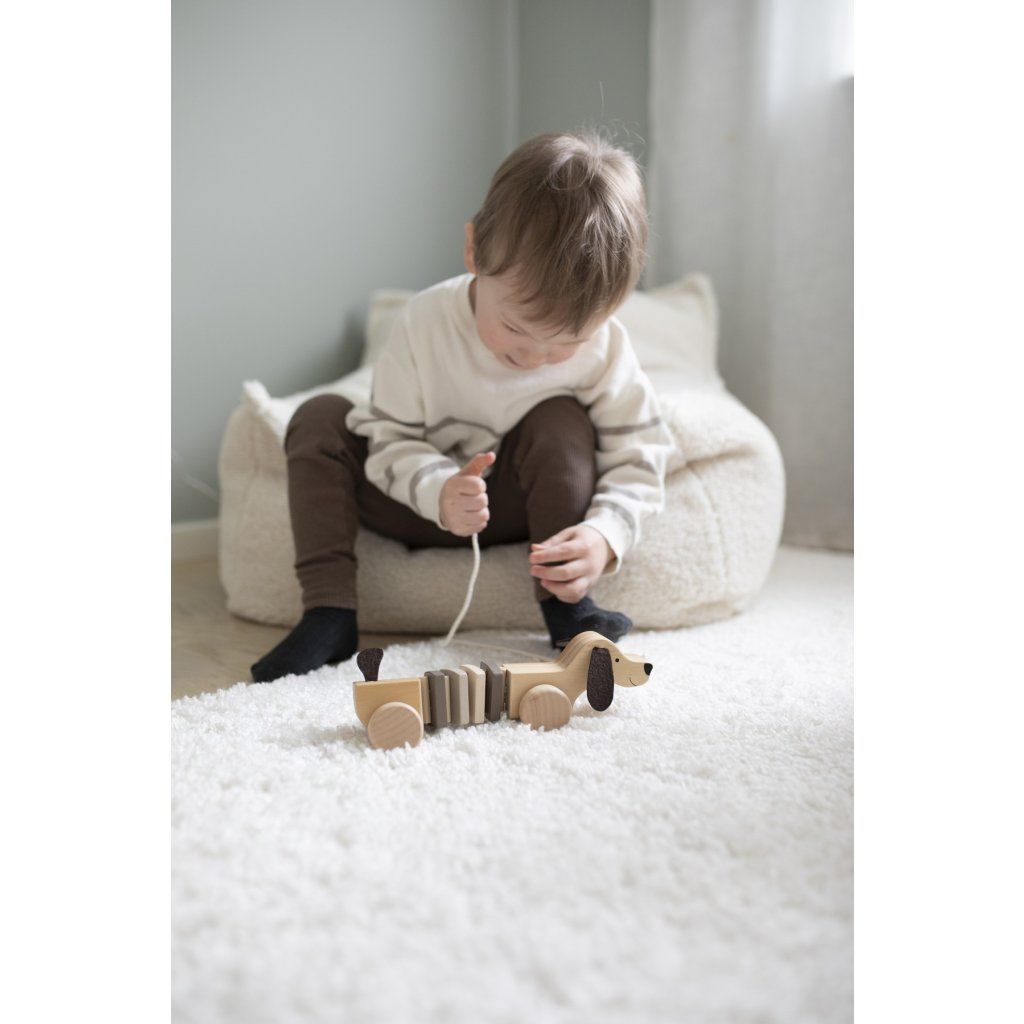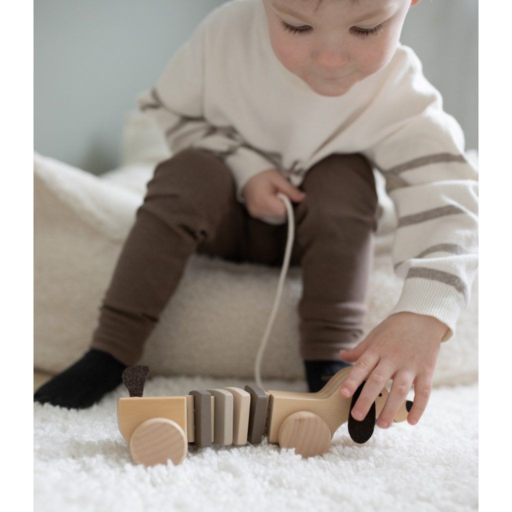 Roztomilá dřevěná tahací hračka ve tvaru pejska, která podporuje první kroky a aktivní pohyb dítěte. Díky pevným kolečkům a lehké konstrukci se snadno pohybuje po různých površích a stává se ideálním společníkem při objevování okolí. Barevné kostky na hřbetě dodávají hračce hravý vzhled a zároveň rozvíjejí vnímání barev.