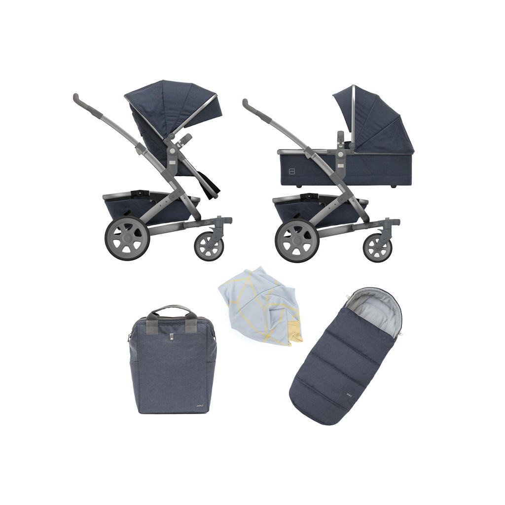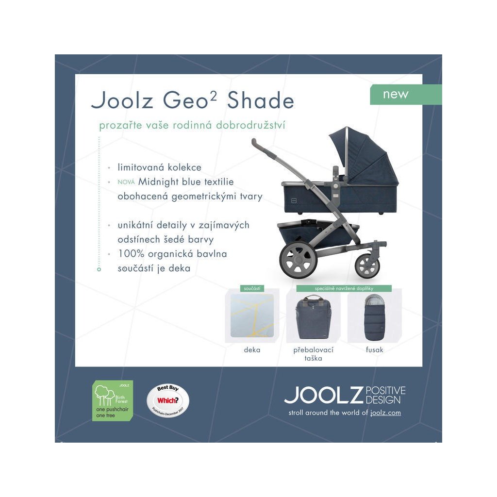 K prozáření vašich rodinných dobrodružství vás zve Joolz spolu s limitovanou novinkou Joolz Geo2 Shade. Podvozek, kolečka a koženkové detaily jsou vyjádřené různými odstíny šedé, které jemně kontrastují s látkou Midnight blue obohacenou geometrickými tvary. Kočárek Joolz Geo2 Shade je navržen tak, aby osvítil váš život a byl k dispozici pouze v omezeném počtu. Joolz Geo2 Shade je dodáván se speciálně navrženou dekou ze 100% organické bavlny v odstínu světle šedé s hlubokým žlutým vzorem. Kočárek doplňuje do uceleného stylu v odstínu Midnight Blue fusak a přebalovací taška. Joolz Geo2 v konfiguraci Mono je vhodný pro jedno dítě od narození a je dodáván v setu s podvozkem, hlubokou korbičkou, sportovním sedátkem a nákupním košíkem XL.
