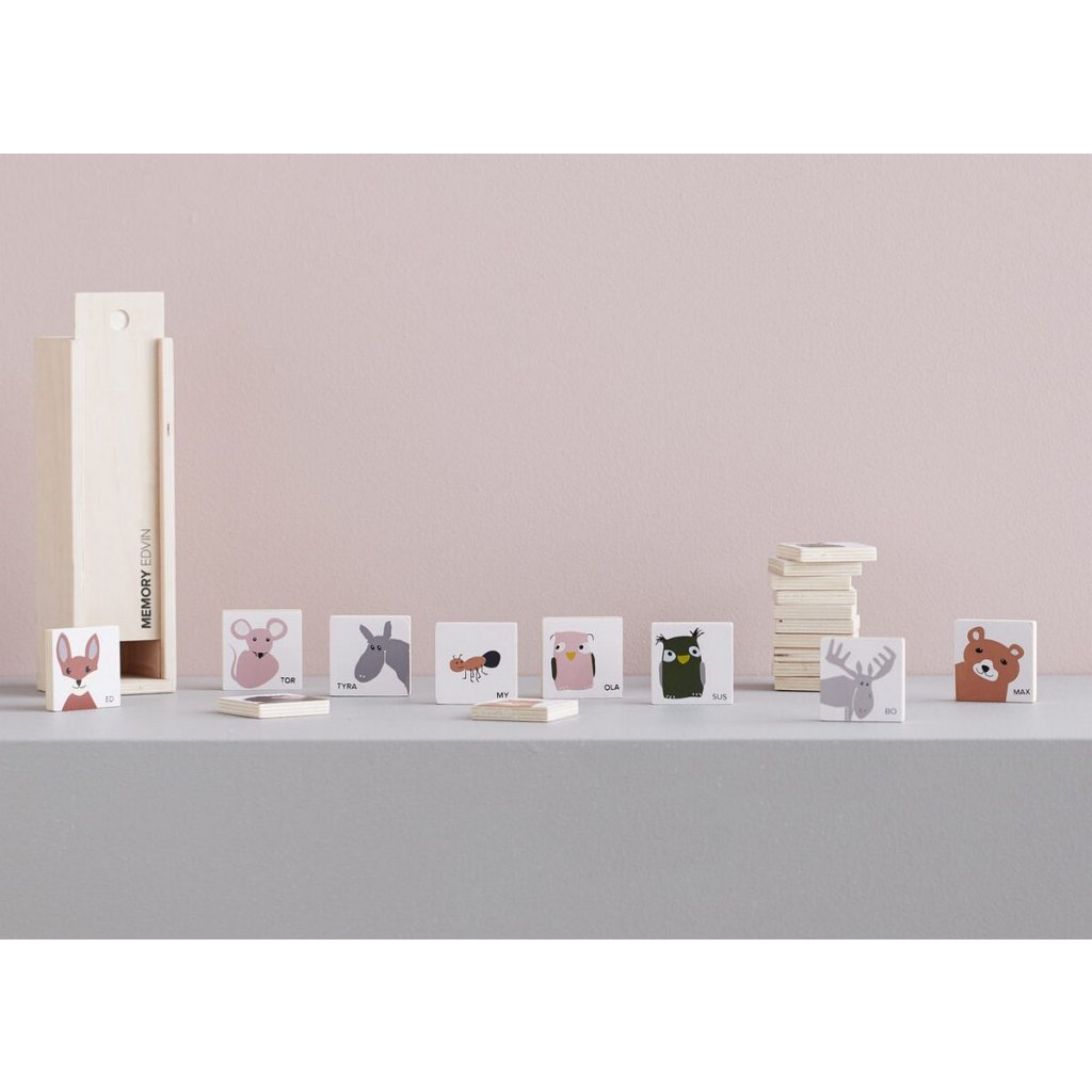 Klasické pexeso v krásném dřevěném provedení s motivy zvířat patří do série hraček Edvin, inspirované skandinávskou přírodou. Jednotlivá zvířata mají svá jména a dítě se tak během hry může učit i písmenka: Ola - růžová sova, Sus - zelená sova, Tor - myš, Bo - los, Max - medvěd, Stella - ježek, My - mravenec, Ed - liška, Tyra - sob a Lo - rys ostrovid. Deset párů dřevěných kartiček je uloženo v dřevěné krabičce.