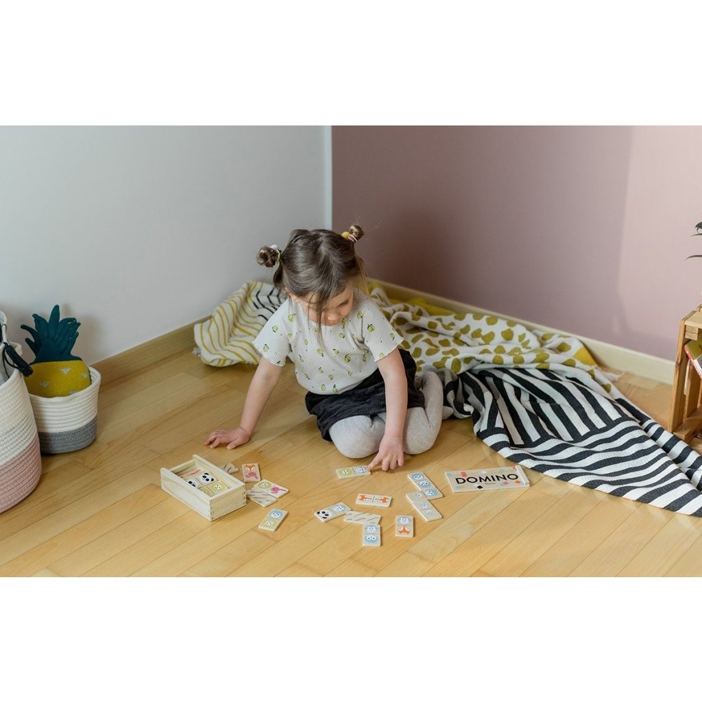 Kindsgut Domino se skládá z 28 domino kamenů s láskyplně navrženými zvířecími motivy. Vyrobeno z kvalitního dřeva, v jednoduchých barvách a decentním designu. Děti mohou hravou formou rozvíjet jemnou motoriku a trénovat logické myšlení. Dřevěné domino je úhledně zabalené a je skvělým dárkem.