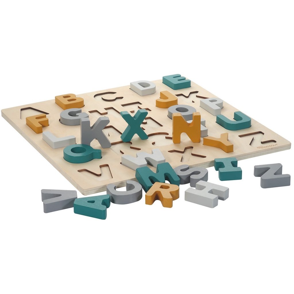 Nádherné dřevěné puzzle německé značky Kindsgut vaše děťátko nejen zabaví, ale také podpoří rozvoj jeho motorických dovedností, koordinace oko-ruka a znalosti písmen. Součástí je základní deska a 26 různobarevných písmen, které lze do základní desky postupně naskládat. Jednotlivé dílky mohou sloužit i jako klasické dřevěné kostky. Pro výrobu byly použity materiály šetrné k životnímu prostředí neobsahující škodlivé látky. Puzzle jsou vhodné pro děti od 24 měsíců.