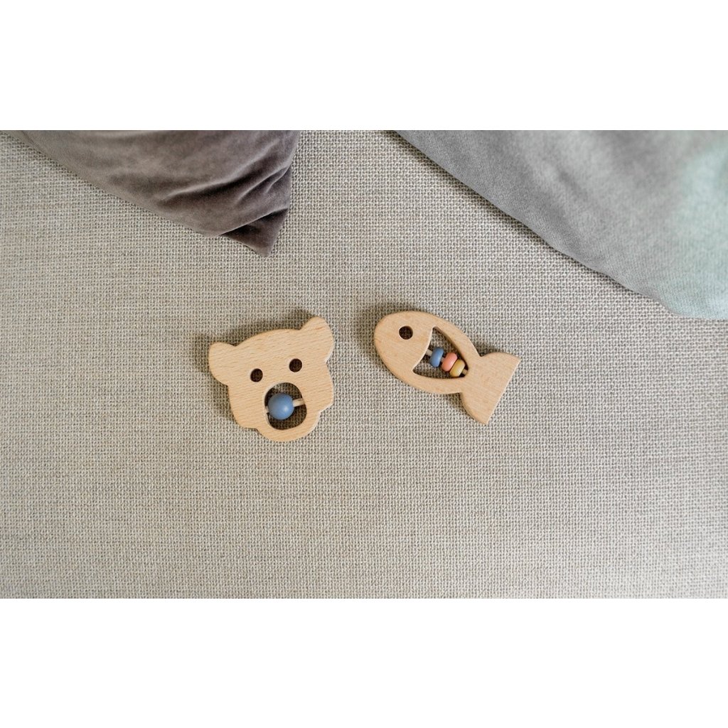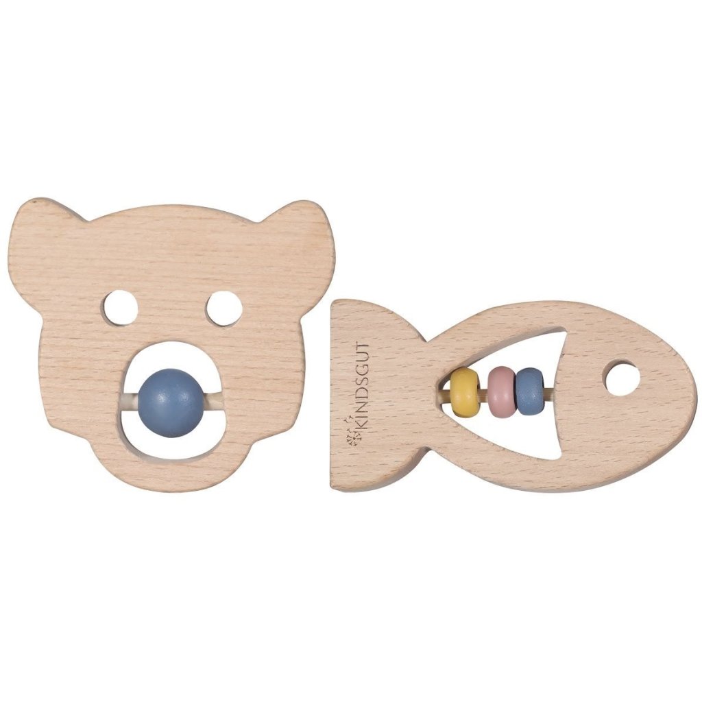 Sada kousátek Kindsgut se skládá ze dvou kousacích kroužků ve tvaru ryby a medvěda. Přírodní dřevo má měkký povrch. S kousacími kroužky se vaše miminko naučí poprvé uchopovat a prostřednictvím dřevěných korálků může také poslouchat zvuky, které vydávají. Sada kousátek je dodávána pěkně zabalená v jednoduchém látkovém sáčku, a proto je vhodná především jako dárek k narození.