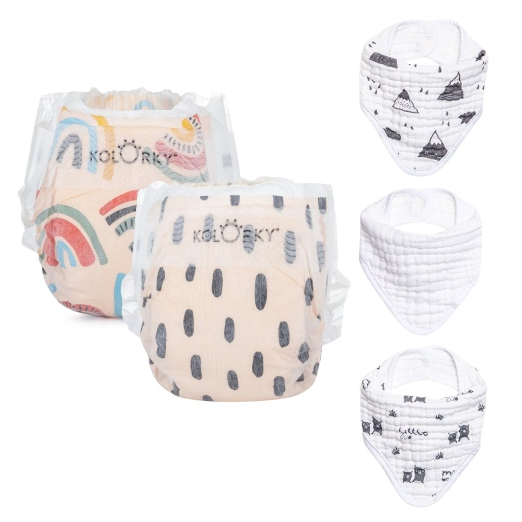 KOLORKY DAY Set Déšť a Duhy Jednorázové eko plenky + Bryndák 3 ks Mountains