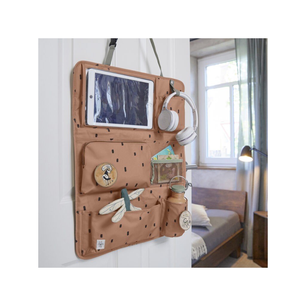 Stylový a praktický organizér ve velmi kvalitním provedení pro úhledné uspořádání všech věcí, které potřebujete na cesty s vaší ratolestí. Organizér můžete zavěsit pomocí nastavitelného a rozepínatelného popruhu, obsahuje extra velkou průhlednou přihrádku na tablet či obrázky, kapsu na knihu o velikosti A4, síťovanou kapsu a několik dalších otevřených kapes pro uložení drobností.