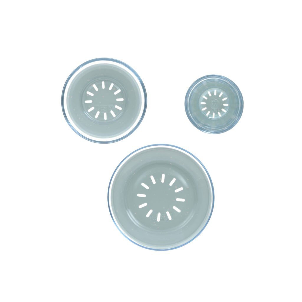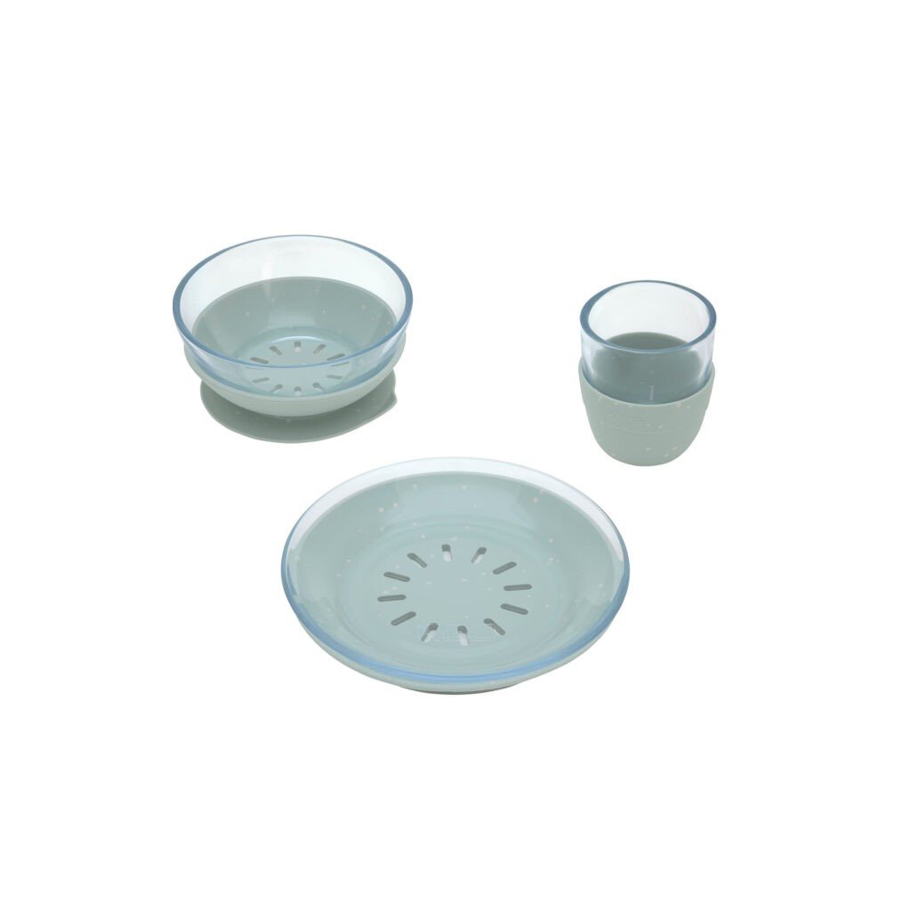 Skleněný jídelní set s odnímatelnými silikonovými základnami je vyroben z borosilikátového skla, které je stabilnější a robustnější než běžné sklo. Silikonové základy zajistí, že nádobí nebude klouzat po stolu. Je tedy skvělým pomocníkem při stolování a prvních pokusech vaší ratolesti se vlastnoručně nakrmit.