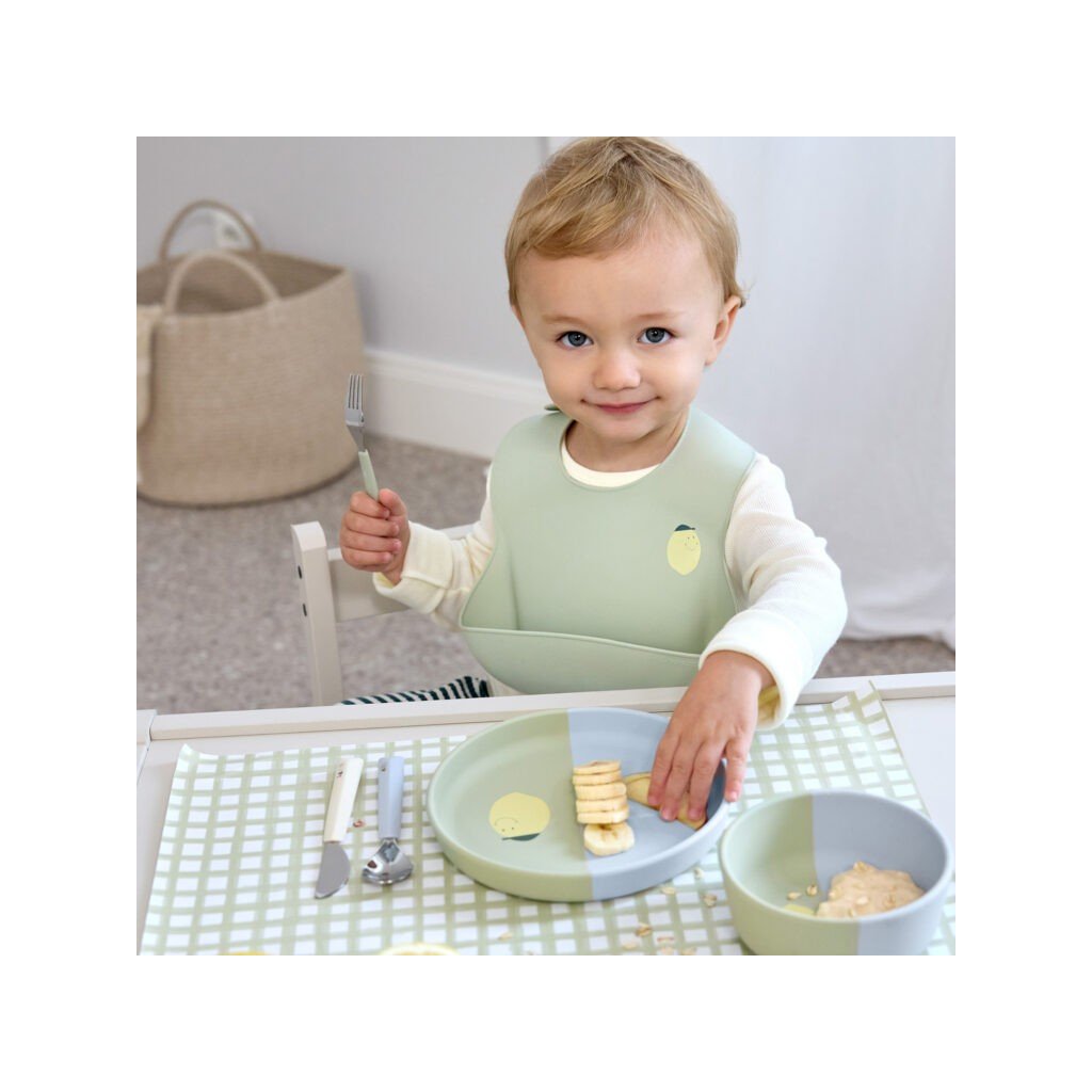 Silikonový jídelní set je skvělým pomocníkem při stolování a prvních pokusech vaší ratolesti se vlastnoručně nakrmit. Společně se samostatně dostupným příborem se silikonovou rukojetí jsou děti připraveny na všechna jídla.