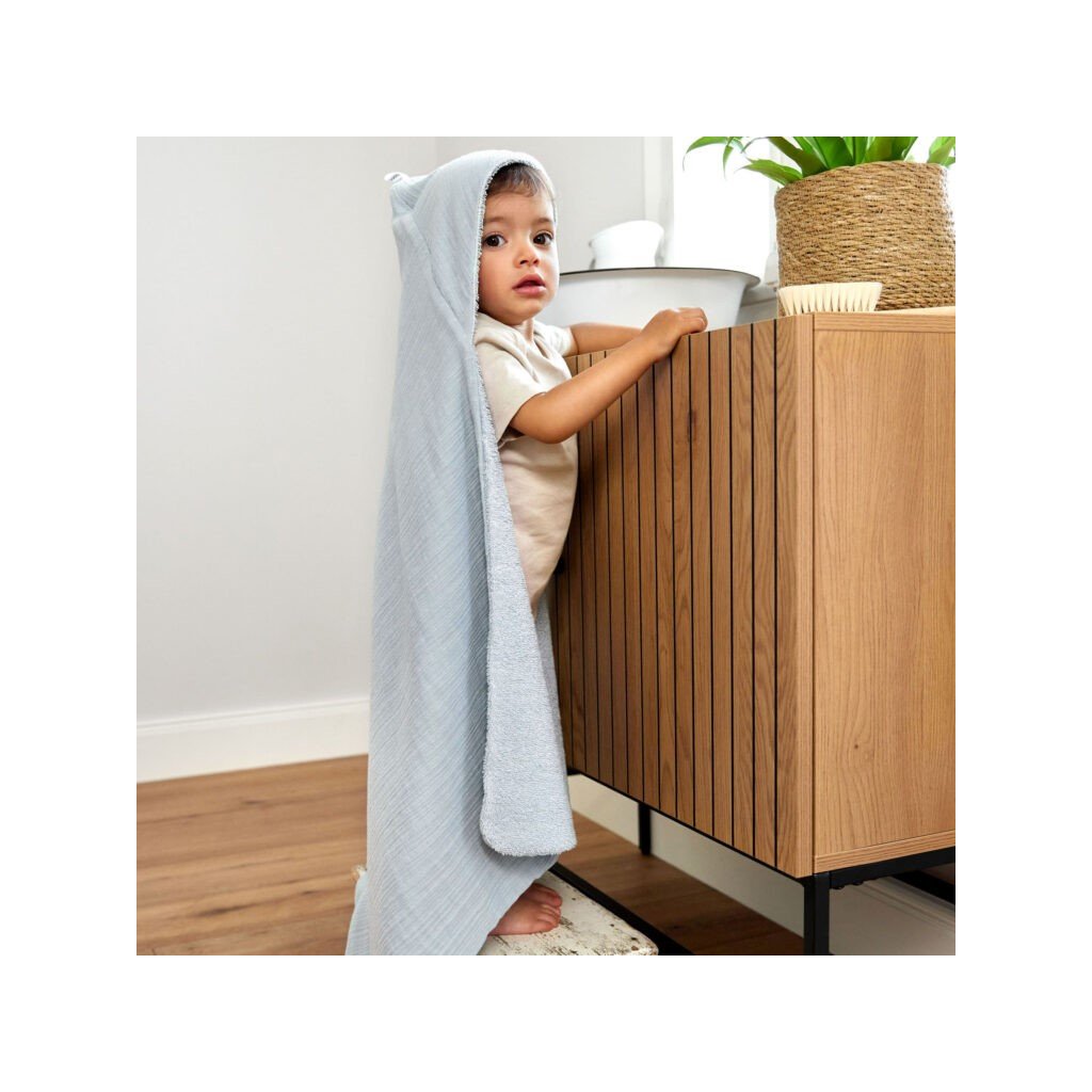 Ručník s kapucí je určený pro malé milovníky vody. Je vyrobený z předepraného mušelínu a froté, které jsou prodyšné a vhodné zejména pro dětskou pokožku. Kapuce chrání hlavu a krk dítěte a udržuje je tak v teple. Ručník je vhodný nejenom pro každodenní domácí používání, ale i na plavání s dětmi. Je určen dětem od narození do 2 let.
