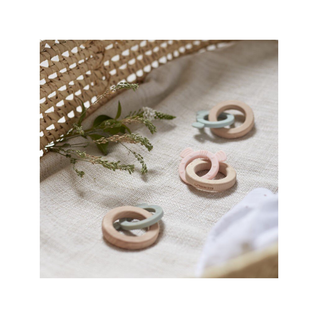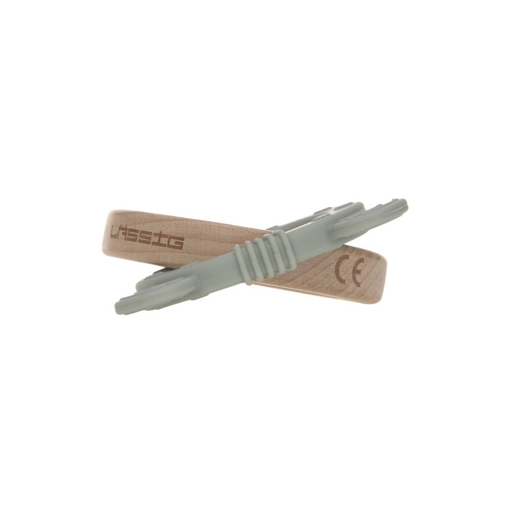 Teether Bracelet Wood - Silicone, Little Chums je jedním z dalších výrobků značky Lässig, vyznačujícím se vysokou kvalitou materiálů, jejich zpracováním a svojí funkčností. Jedná se o perfektní kombinaci kousátka a hračky, vyrobené v kombinaci dřeva a silikonu. Velikost a materiál jsou ideálně navrženy do rukou malých průzkumníků a podporují stimulaci jednotlivých smyslů dítěte. Hračka je složena ze dvou navzájem propojených částí. Při zvednutí hračky do oblasti očí je stimulována koordinace rukou a zraku dítěte, a to se tak učí uchopovat věci a koordinovat své motorické dovednosti. Zároveň jeho pozornost přitahují dvě různé barvy a dva materiály hračky. Kousátko ve tvaru dvou propojených kroužků s vyčnívajícími elementy má zklidňující účinky na dásně a pomáhá redukovat bolest v době prořezávání zoubků. Zklidňující účinek je možné zvýšit vložením kousátka do ledničky. Výrobek je vhodný pro děti od narození.