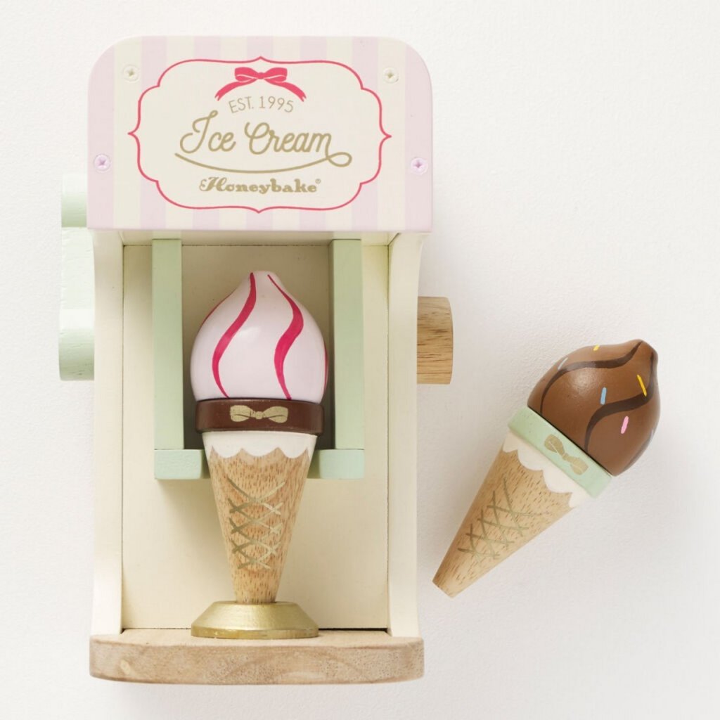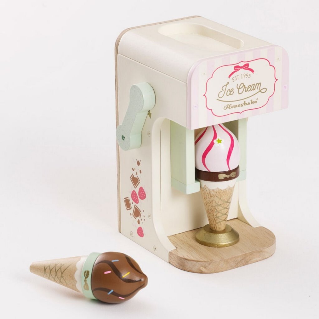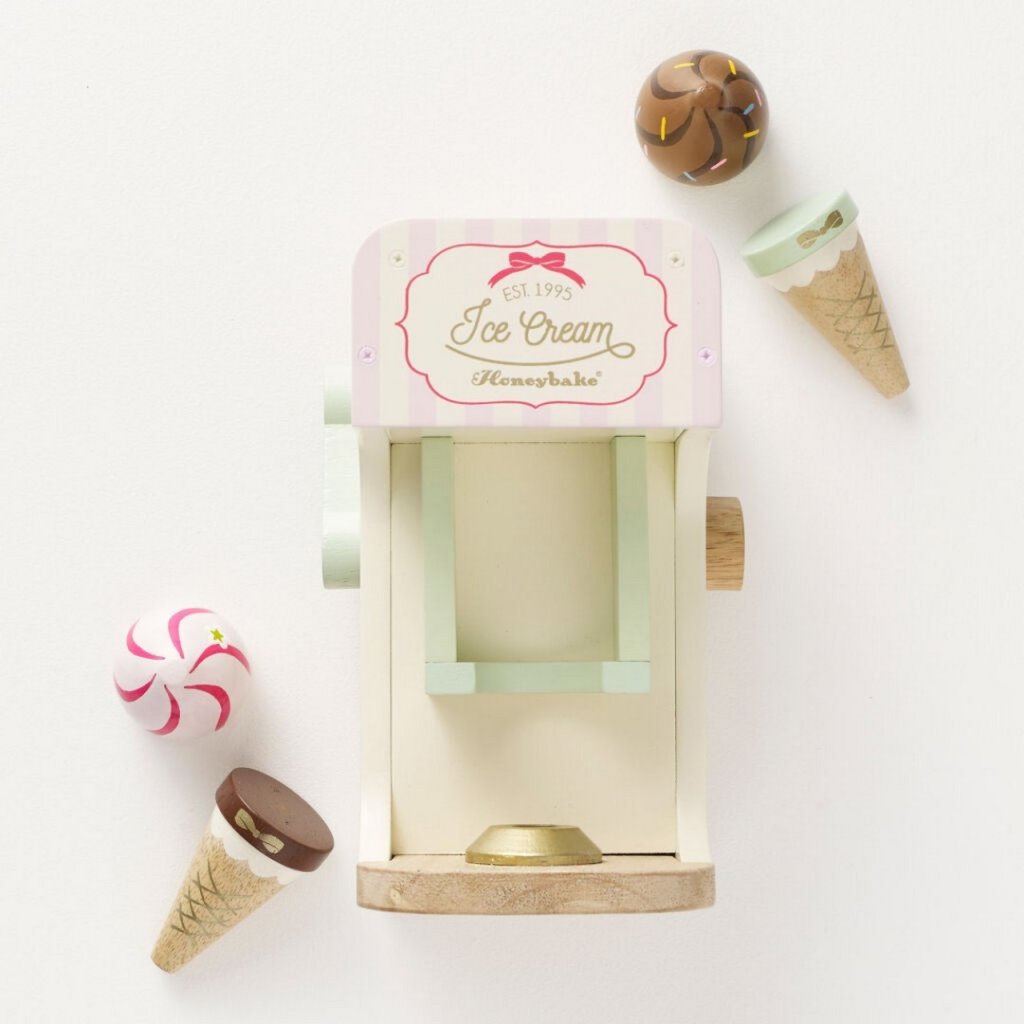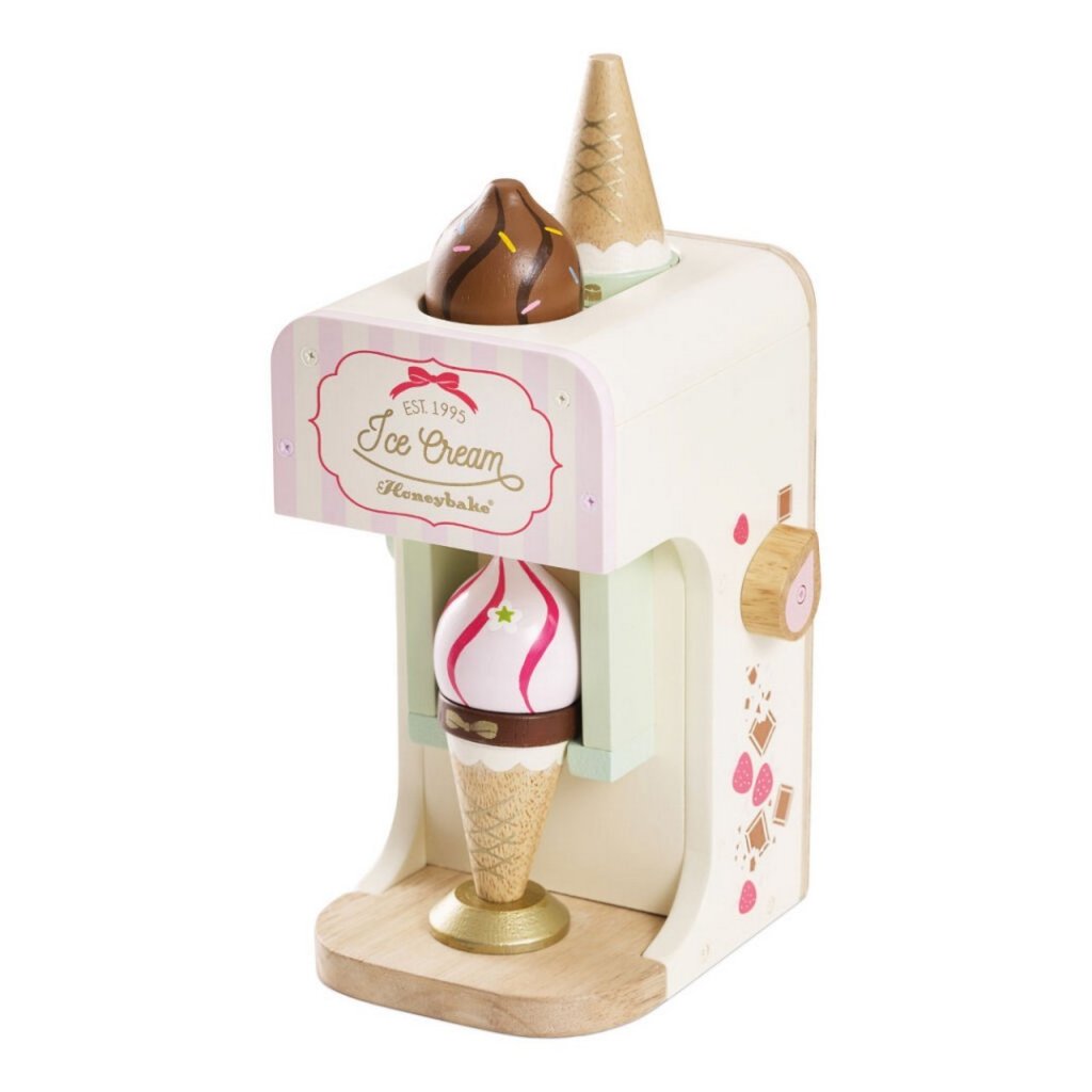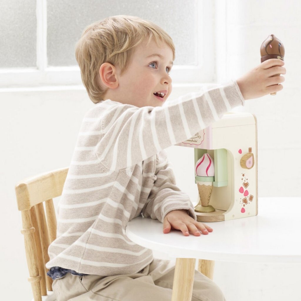 Ušlehejte si vlastní porci zábavy! Stroj na zmrzlinu je tradiční dřevěná hračka, s kterou si děti užijí hodiny zábavy. Jakou příchuť si namíchají jako první? Malováno pěknými pastelovými barvami, nechybí ani zlaté detaily, zmrzlinovač má opravdový retro nádech. Kornout vložte do stojánku, teď už jen stačí vybrat příchuť, otočit knoflík, zatáhnout za páčku a vložit správný kopeček zmrzliny do kornoutu. Realistická hračka děti nadchne pro hru na role. V balení 2 magnetické kornouty a 2 magnetické kopečky zmrzliny.