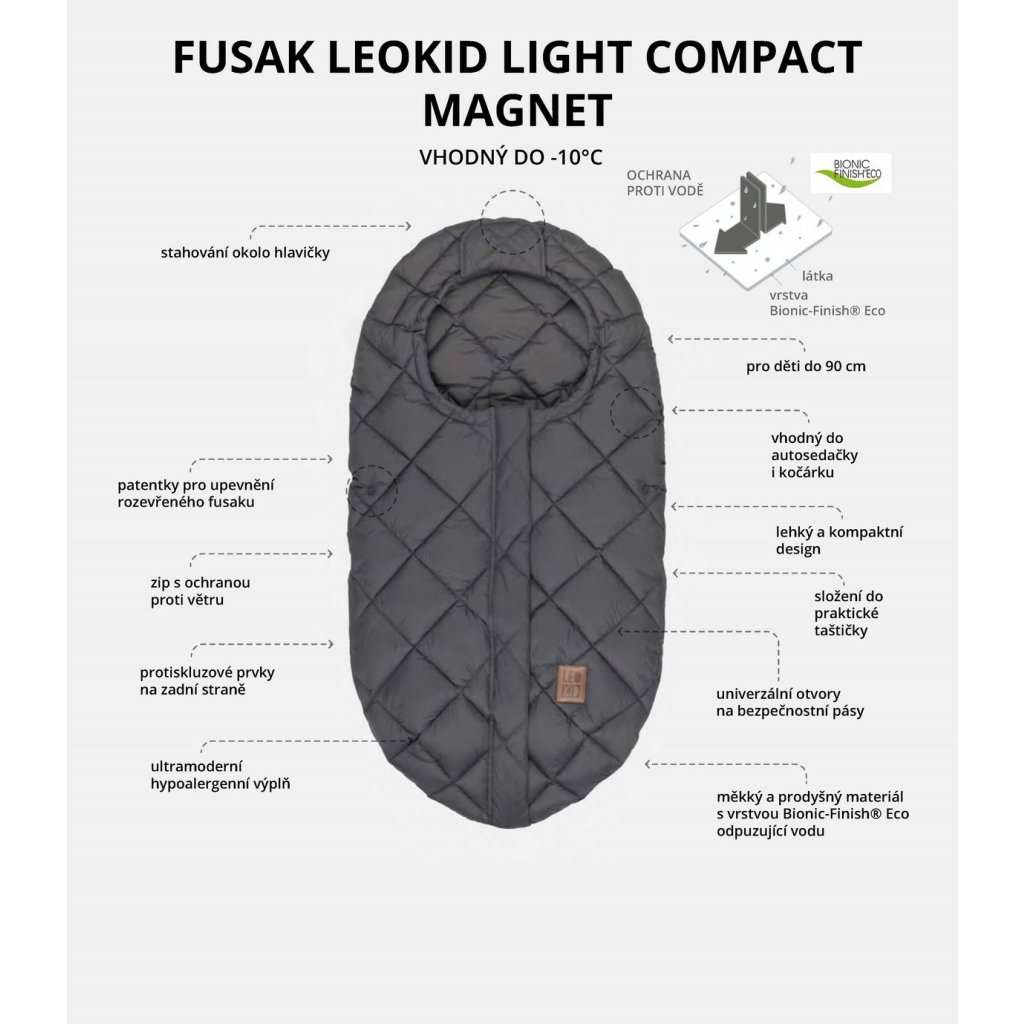 Fusak Light Compact je vyroben pro děti do výšky 80 cm. Díky své lehkosti a kompaktnosti je ideální na cesty. Fusak lze snadno složit a uložit do speciální tašky, která je součástí balení. Udržuje teplo při procházkách a chrání dítě před větrem, deštěm a sněhem. Kolem hlavičky lze stáhnout, má ochranou kapsičku na šňůrku pro stahování. U modelu Light Compact je zip s ochranou proti větru ve střední části fusaku. Po stranách jsou patentky, díky kterým lze fusak otevřít do písmene V. Fusak lze použít v každém kočárku a autosedačce s tří- a pětibodovými bezpečnostními pásy, protože má klasický tvar a univerzální systém drážek pro bezpečnostní pásy. Pro procházky na podzim, v zimě, na jaře a v chladném létě.