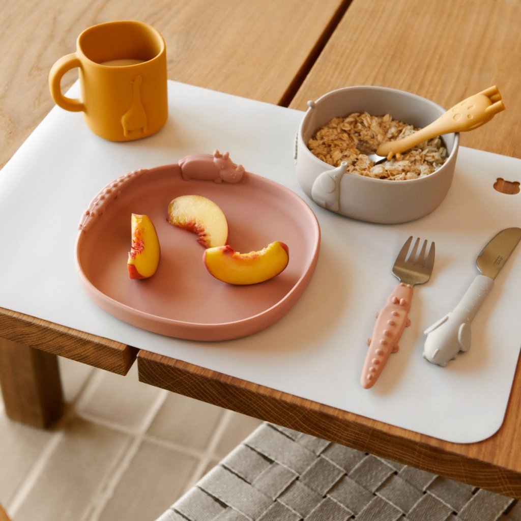 Silikonový jídelní set s roztomilými 3D motivy. Set se skládá z misky, hrnečku a talíře.