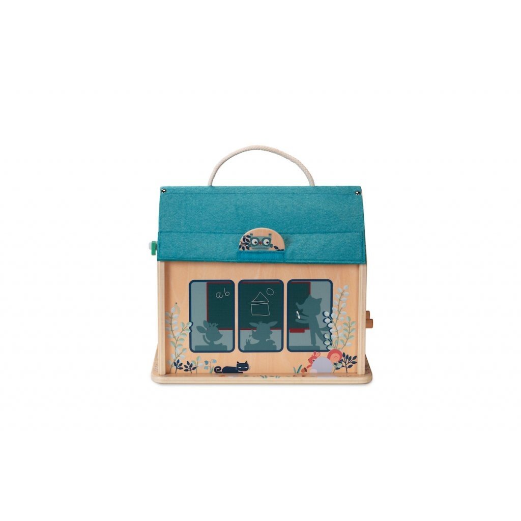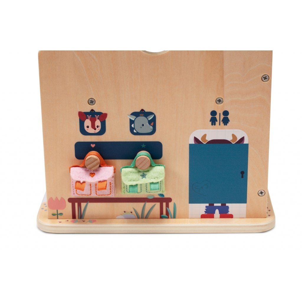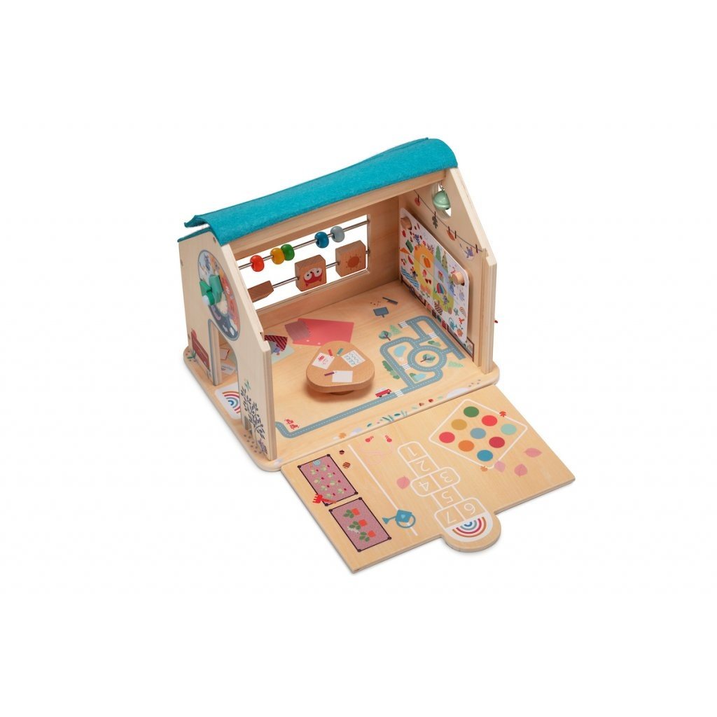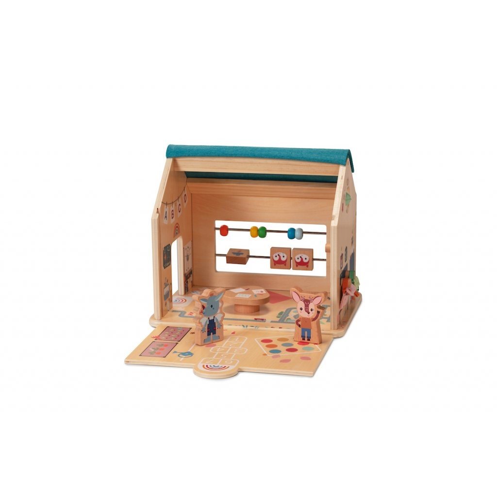 Moje první škola je dřevěná hračka pro děti od 2 let, se kterou mohou vymýšlet skvělé školní příběhy podle své fantazie. Cink, cink, zvonek zvoní, přestávka končí, je čas vrátit se do třídy za paní učitelkou. Co nového se dnes asi naučíme? Tato hra s představivostí nabízí mnoho aktivit: počítadlo, věšák na zavěšení školních tašek, odnímatelný panel pro přístup do interiéru školy, zvonek, hodiny... Vysoce kvalitní hračka, která umožňuje dívkám a chlapcům připravit se na vstup do školy a rozvíjet jejich fantazii. Po odkrytí střechy se stevře třída plná překvapení a her.