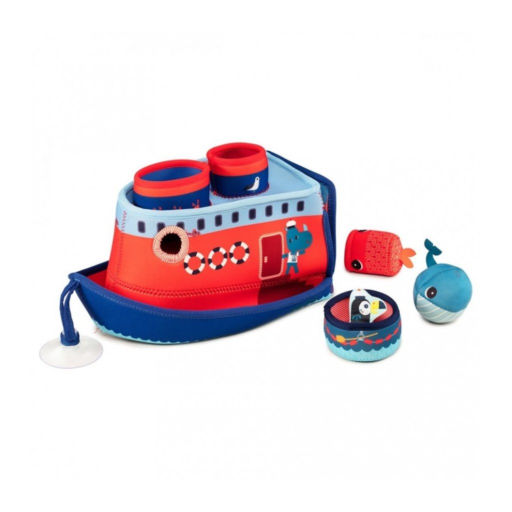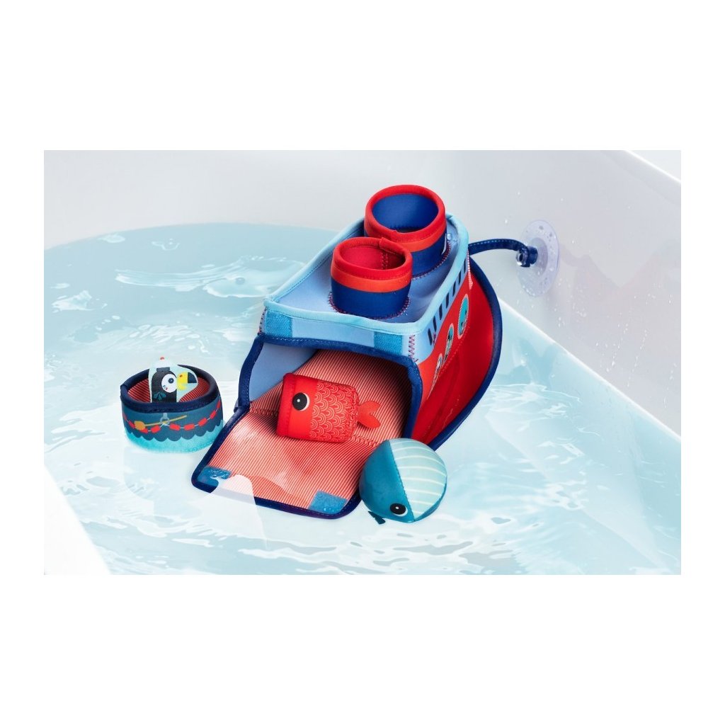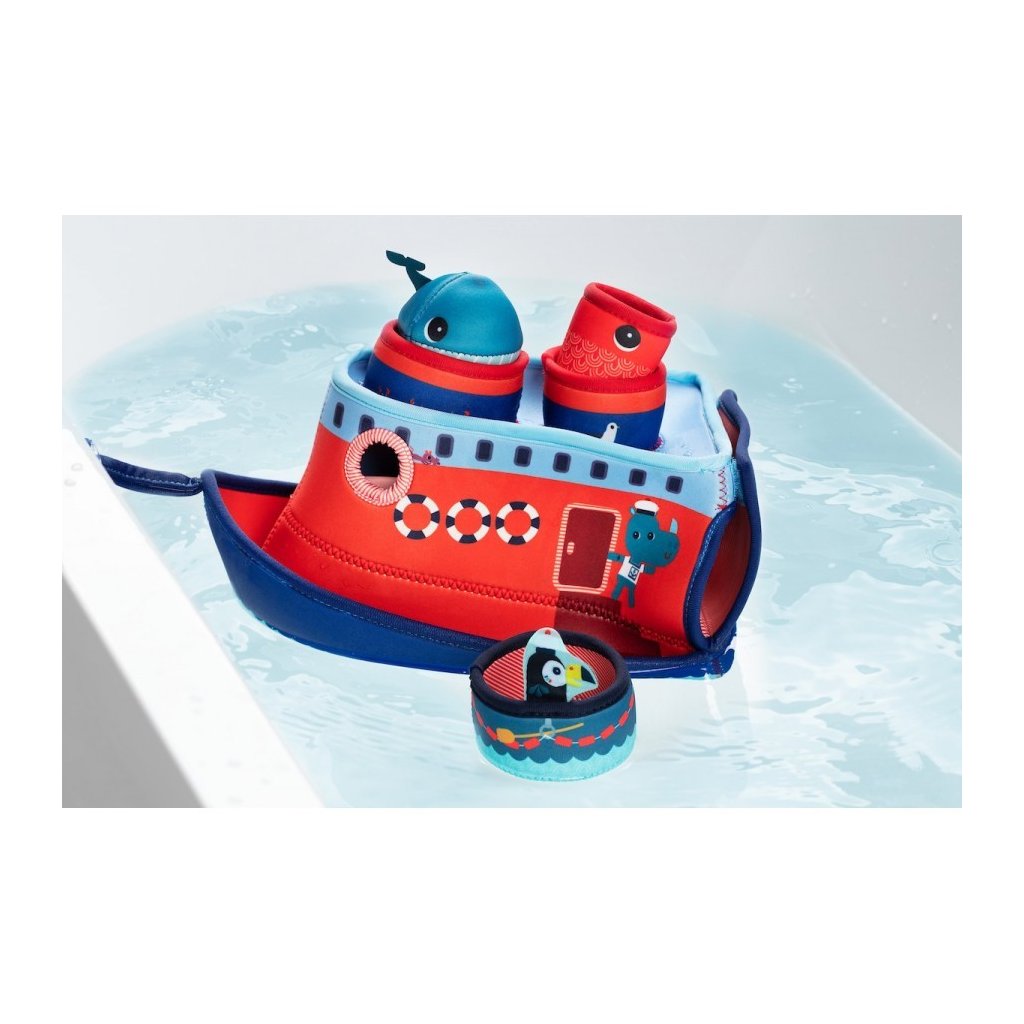 Všichni na palubě! Kapitán Marius vytahuje kotvu a vyplouvá na širé moře. S touto neoprenovou lodí se z každé koupele stane malé dobrodružství. Malé děti si mohou během koupání hrát a rozvíjet své motorické schopnosti. Vodní zábava zaručena! Obsahuje 4 neoprenové prvky: 1 velká loď, 1 neoprenový kelímek (záchranný člun), 1 míč (velryba) a 1 neoprenový kelímek (ryba).
