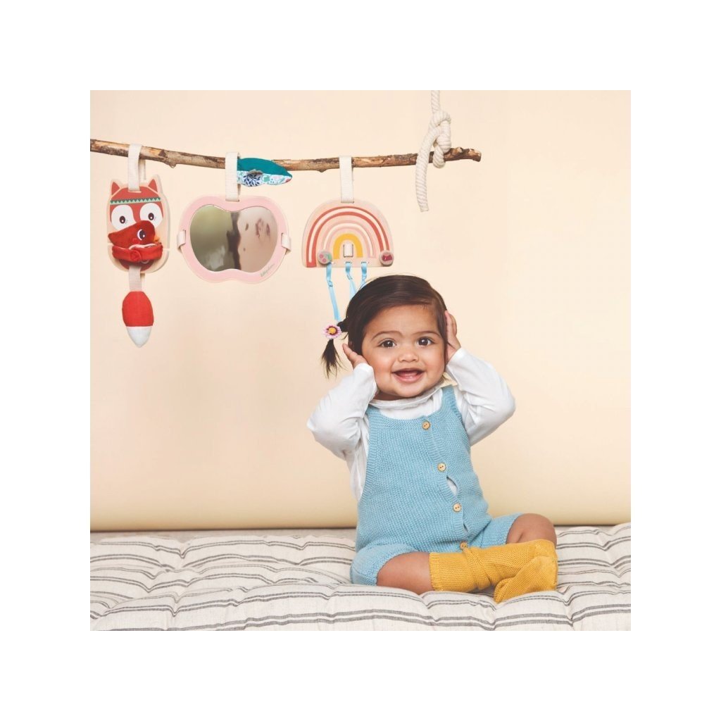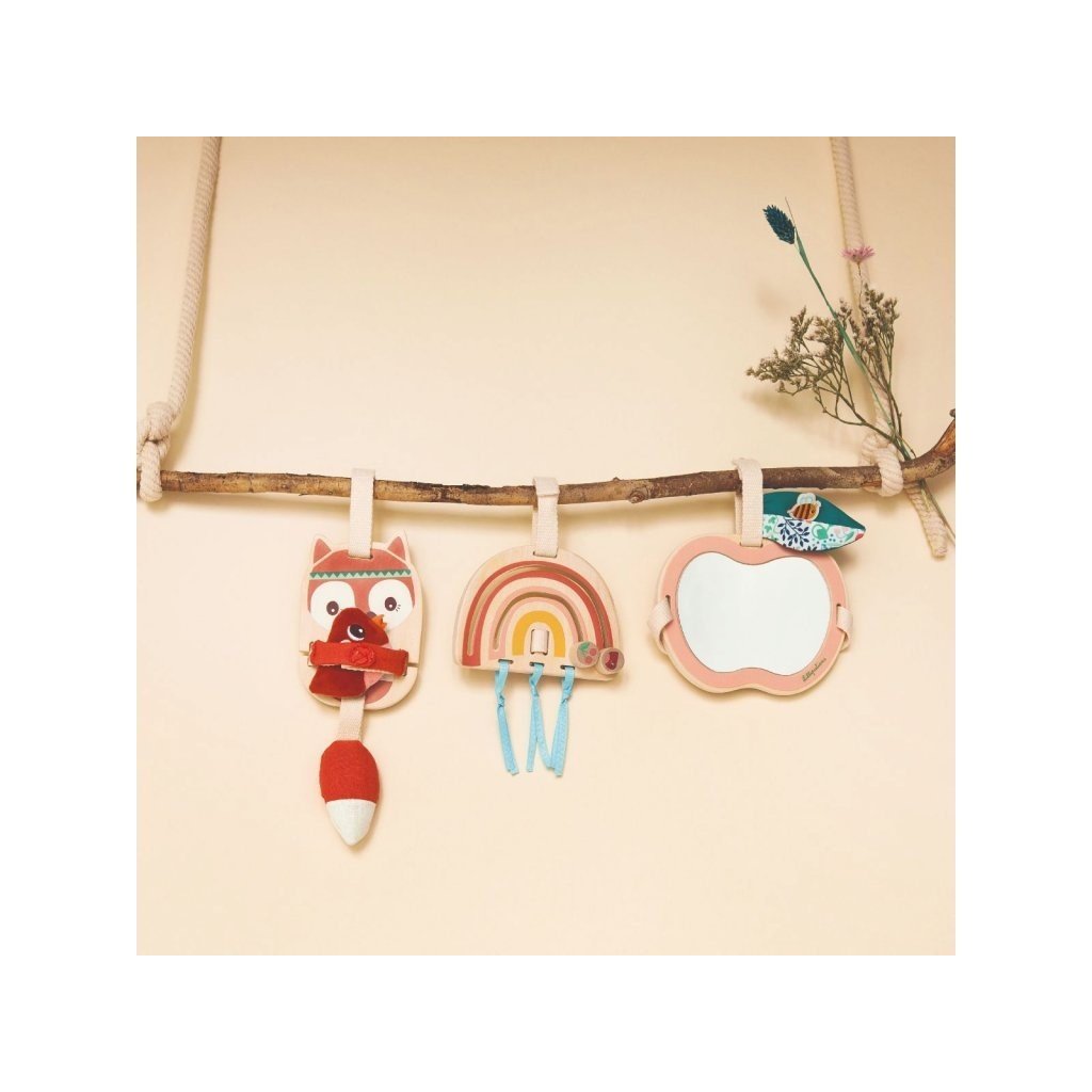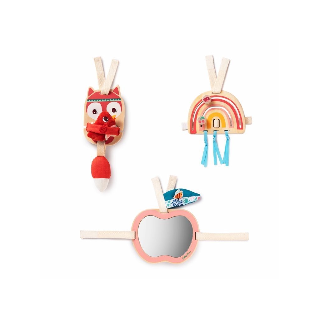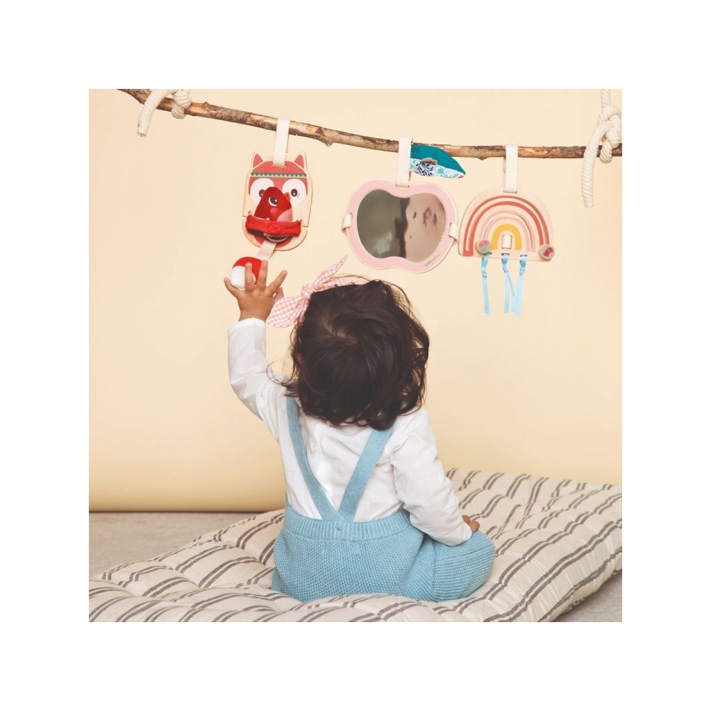 Tato sada se skládá ze 3 samostatných prvků. Všechny se snadno připevňují k postýlce či ohrádce a každý panel nabízí dětem širokou škálu různých materiálů a činností. S touto hračkou máte jistotu, že v postýlce bude mít váš drobeček co dělat a na co se dívat. Hračky jsou vyrobeny z bukového dřeva (FSC), 100% polyesteru a použité barvy jsou na vodní bázi. Povrch hraček lze omývat vlhkým hadříkem.