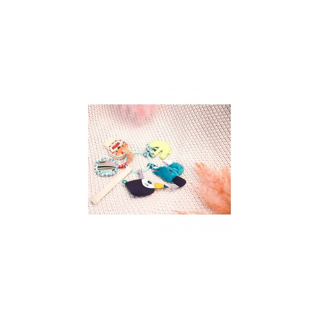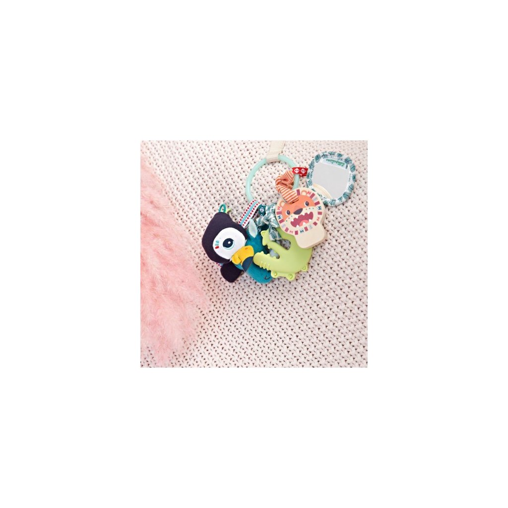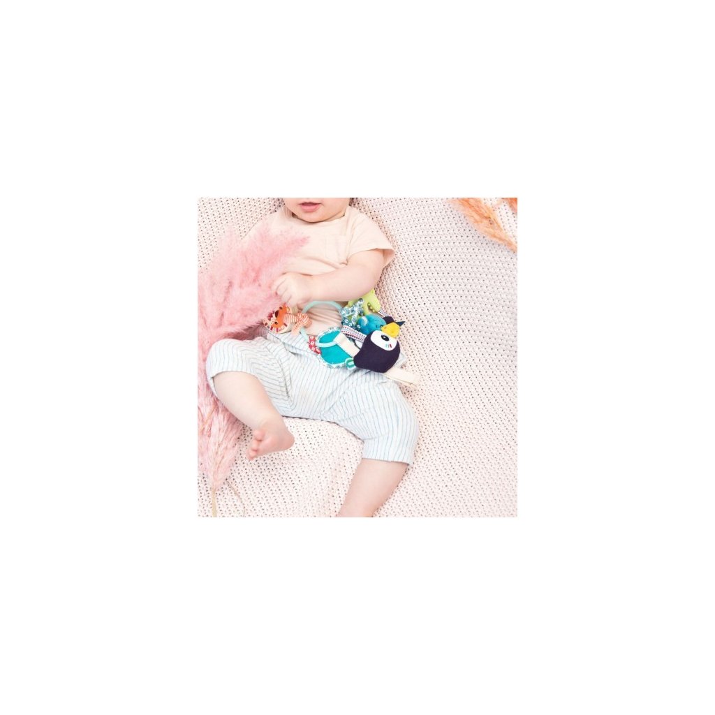 Hračka pro děti od 6 měsíců. Různé tvary, materiály, barvy a zvuky dělají z této senzorické hračky skutečnou cestu objevů pro nejmenší děti. Hračka podporuje rozvoj hmatu a schopnosti uchopit předmět. Jednoduchým a zábavným způsobem se děti učí rozeznávat různé povrchy a reliéfy. Lze ji zavěsit nad postýlku, do kočárku či na autosedačku.