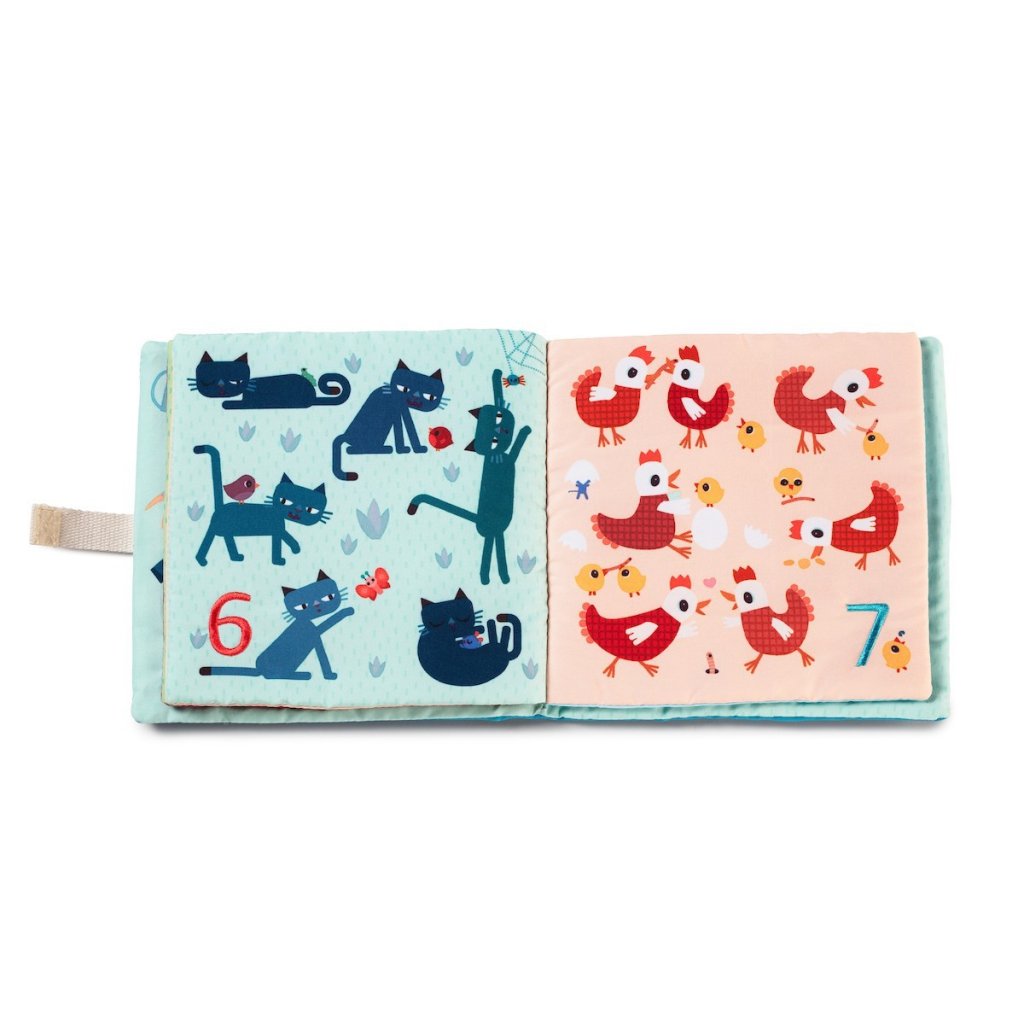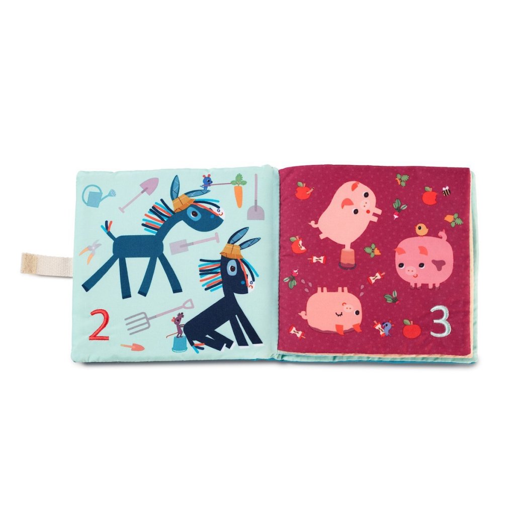 Krásná textilní knížka je určena pro děti od 18 měsíců. Děti se seznamují s čísly a jednoduchou matematikou. Knížka je navržena tak, aby děti zaujala a přiměla je formou hry k učení. Knížka je jednoduchá pro manipulaci. Stránky jsou očíslovány od 1 do 9, děti tak mohou počítat a poznávat hospodářská zvířata současně.