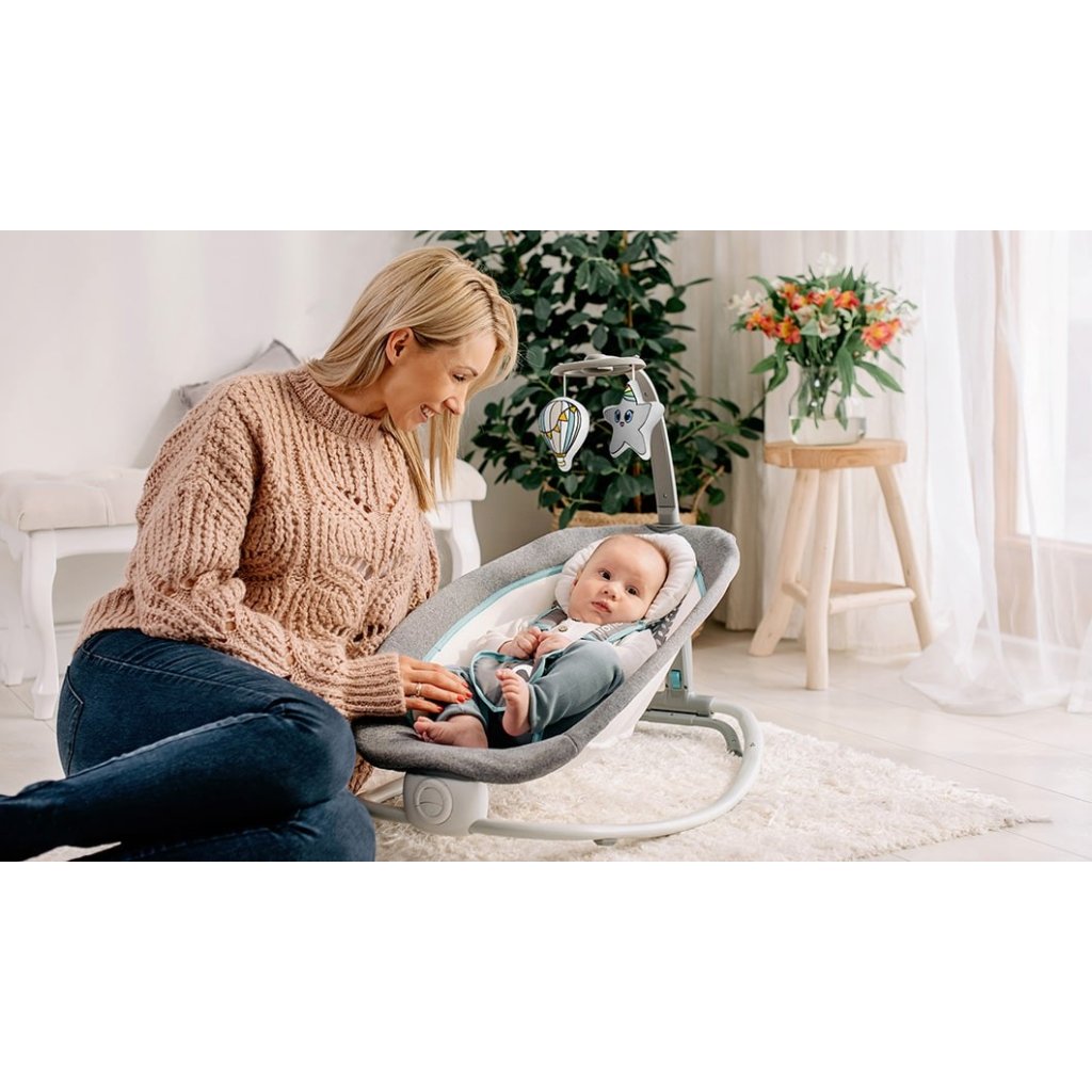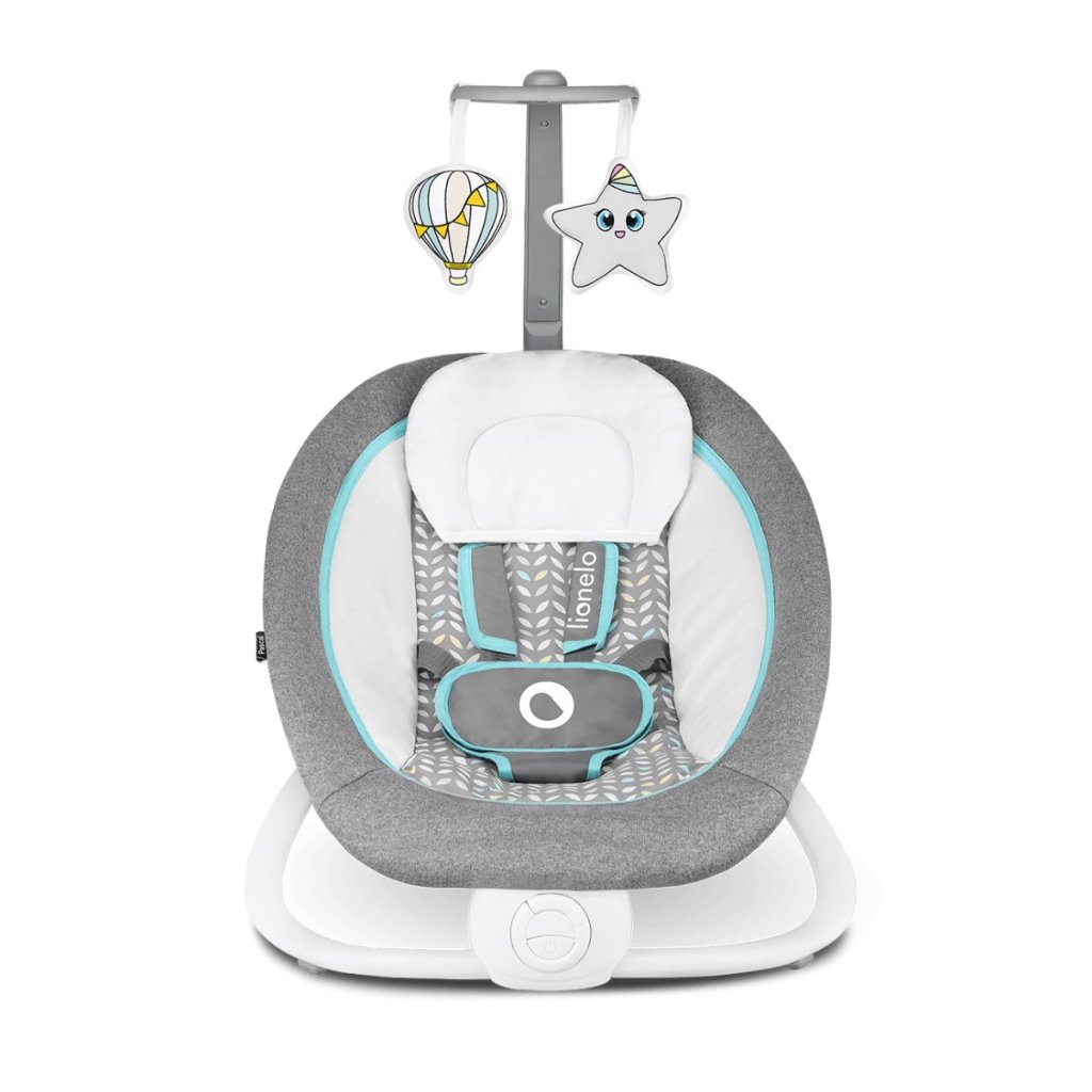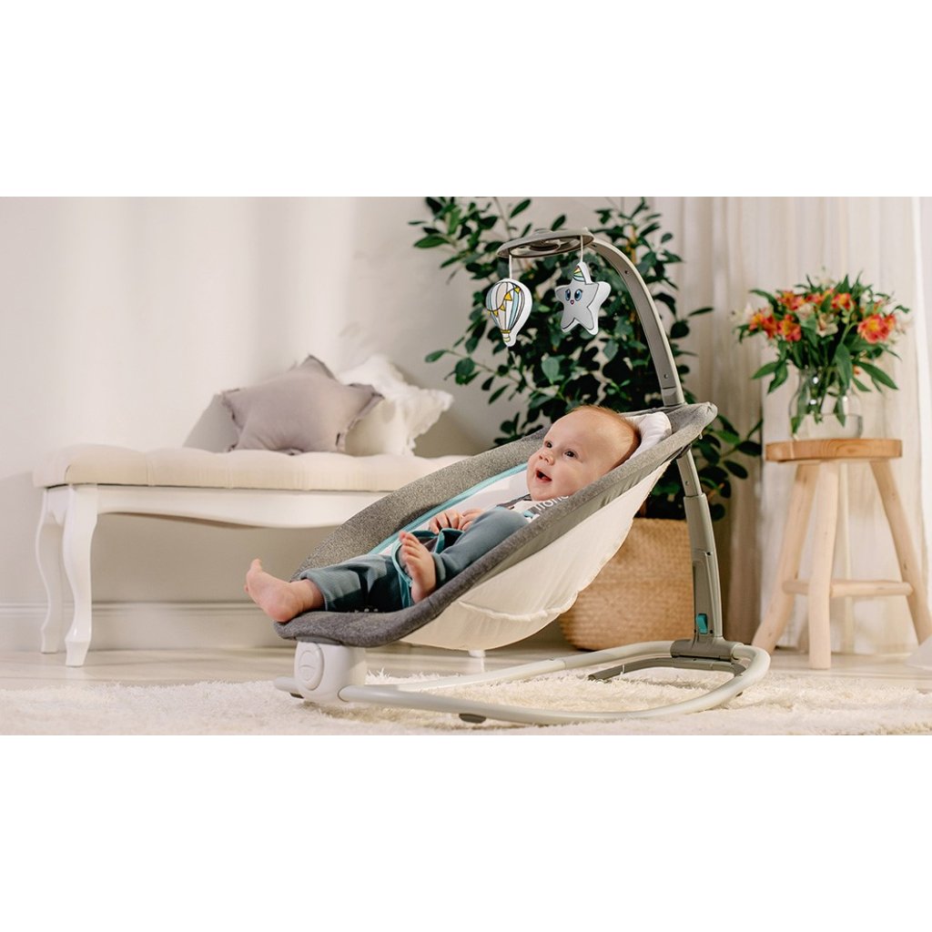 Krásné lehátko a houpačka v jednom. Lehátko má 3-stupňové nastavení zádové opěrky a 12 uklidňujících melodií. Součástí je i odnímatelný stojan s interaktivními hračkami.