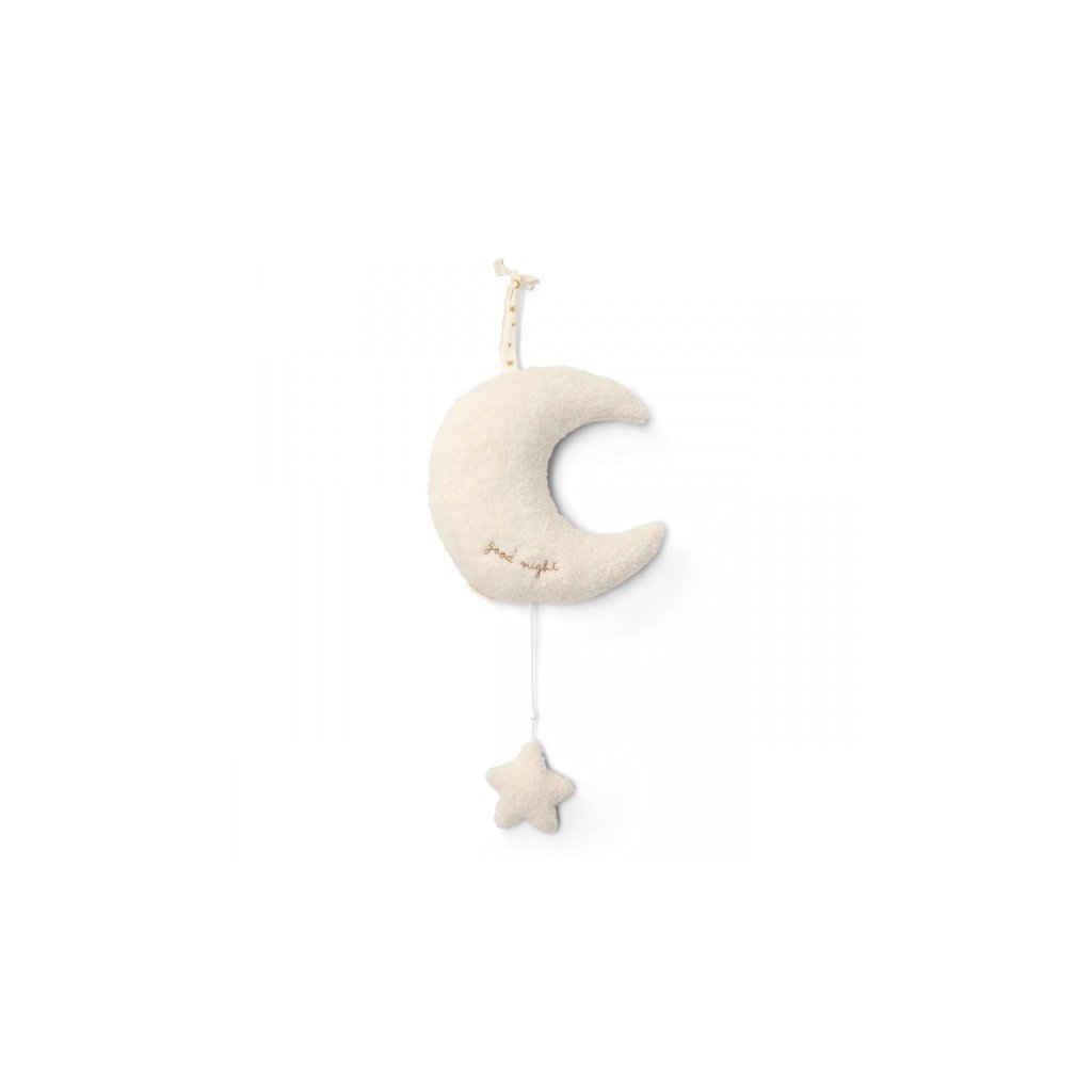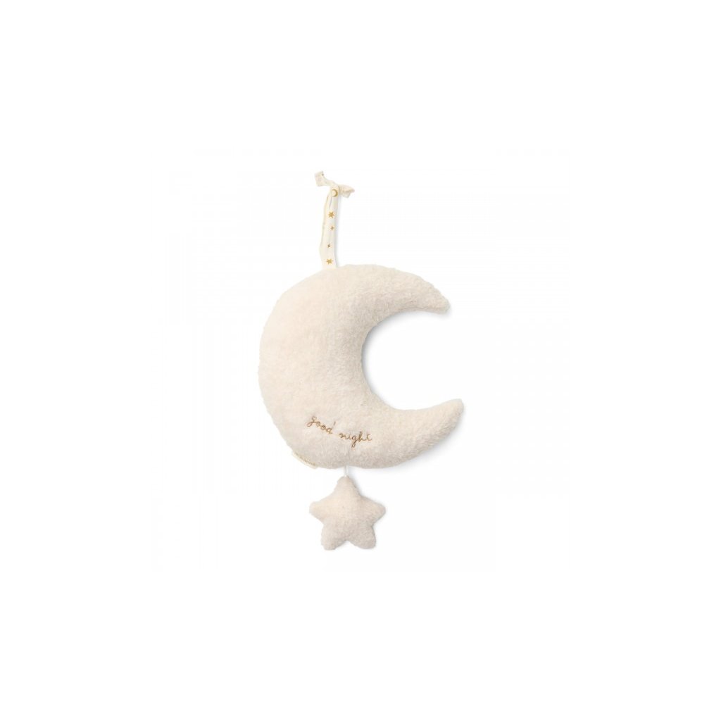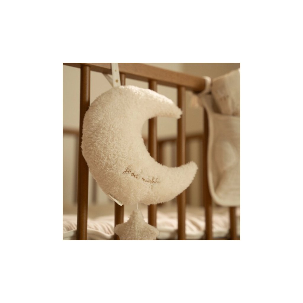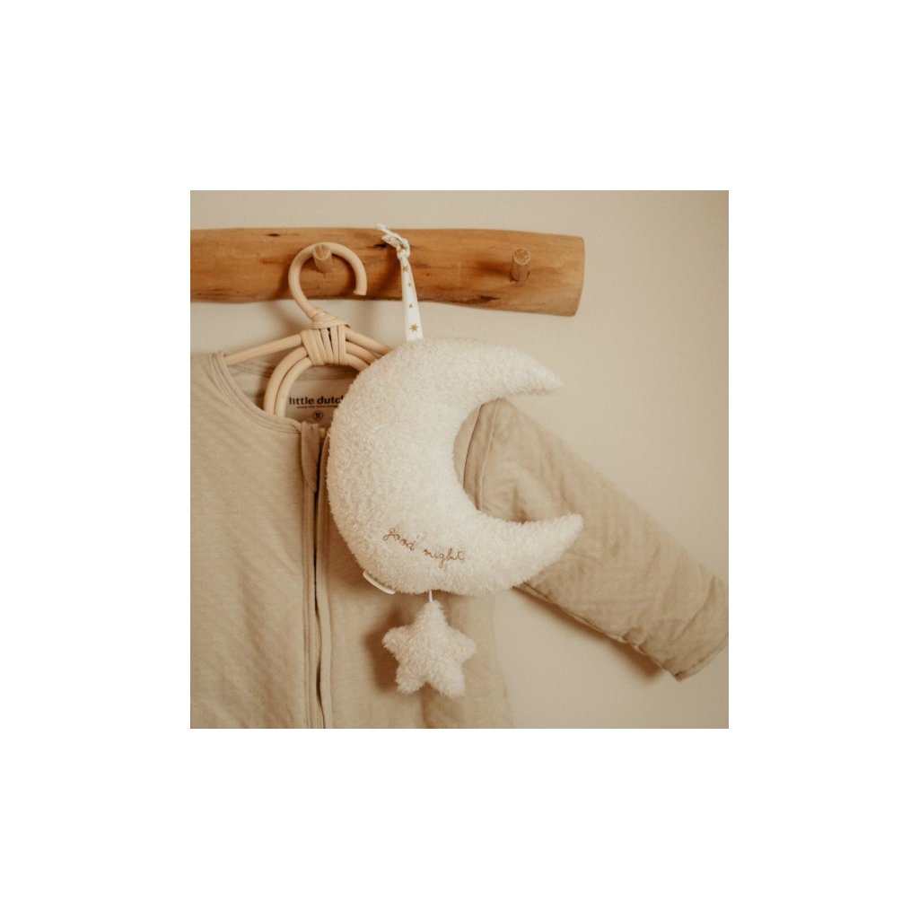Závěsný plyšový měsíček v sobě skrývá natahovací hudební box s příjemnou ukolébavkou, která vaše miminko uklidní a pomůže mu usnout. Měsíček snadno zavěsíte poblíž postýlky. Závěsný měsíc je součástí designové kolekce hraček a doplňků Little Dutch Newborn Naturals. Jedná se o dekorativní předmět, umístěte jej mimo dosah dítěte.