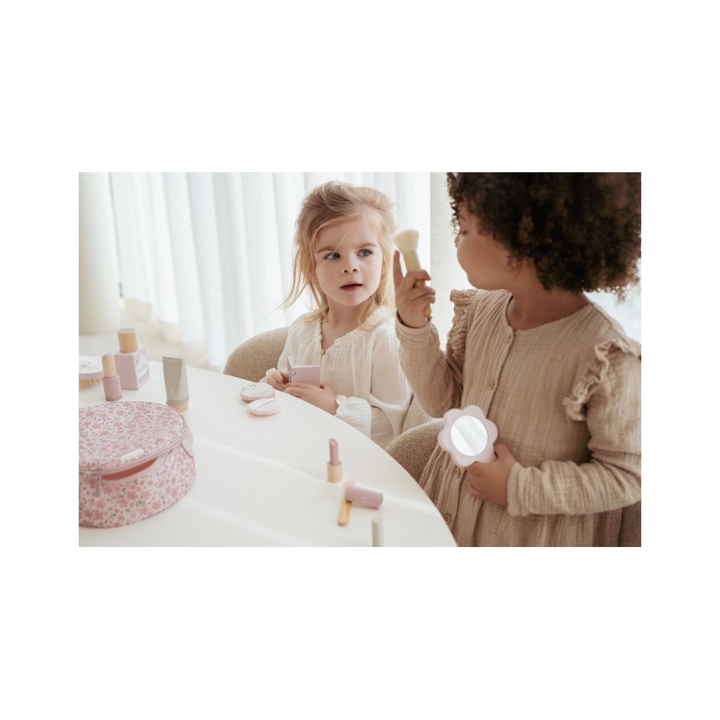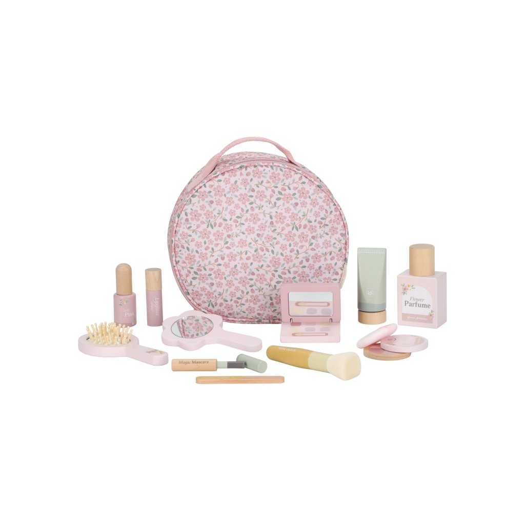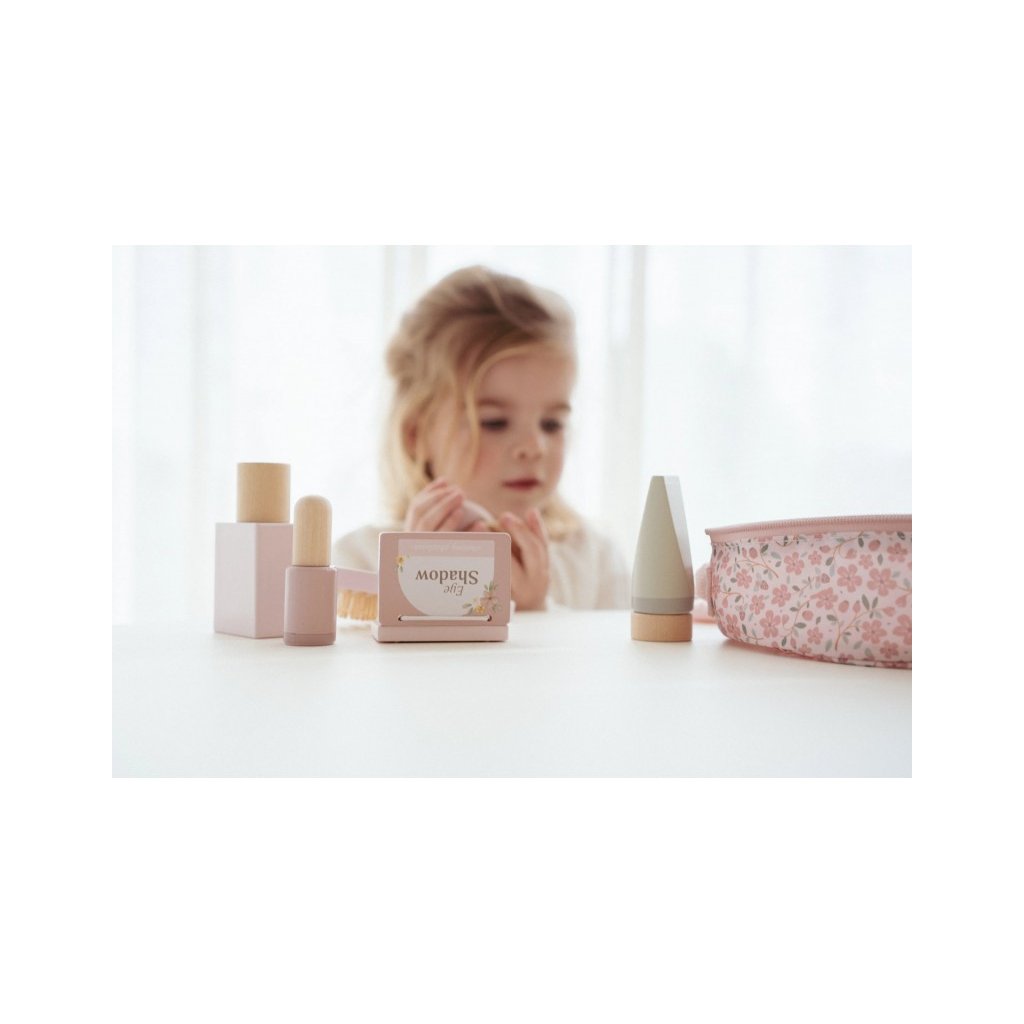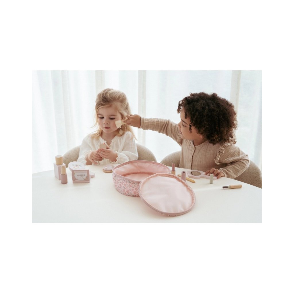 S touto krásnou dřevěnou kosmetickou sadou si vaše malá parádnice užije spoustu zábavy! Měkká látková taštička s květinovým vzorem ukrývá nejrůznější doplňky na hraní – zrcátko, lahvičku parfému, rtěnku, lak na nehty a další nezbytnosti pro každou malou stylistku. Sada je ideální pro hru na dospělé, podporuje rozvoj fantazie a sociálních dovedností – a to vše bez nepořádku. Malé ručičky si mohou trénovat jemnou motoriku a zároveň se cítit krásně, stejně jako maminka. Dřevěné části jsou vyrobené z odolného FSC certifikovaného dřeva. Vhodné pro děti od 3 let.